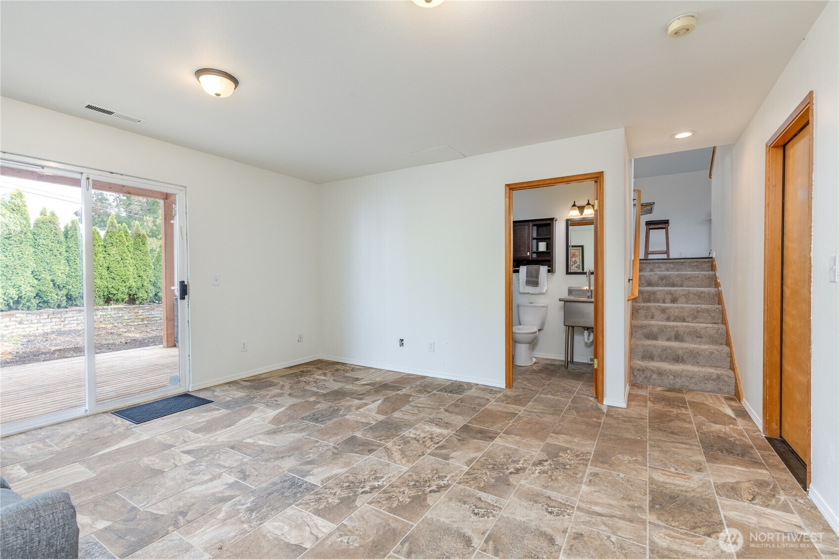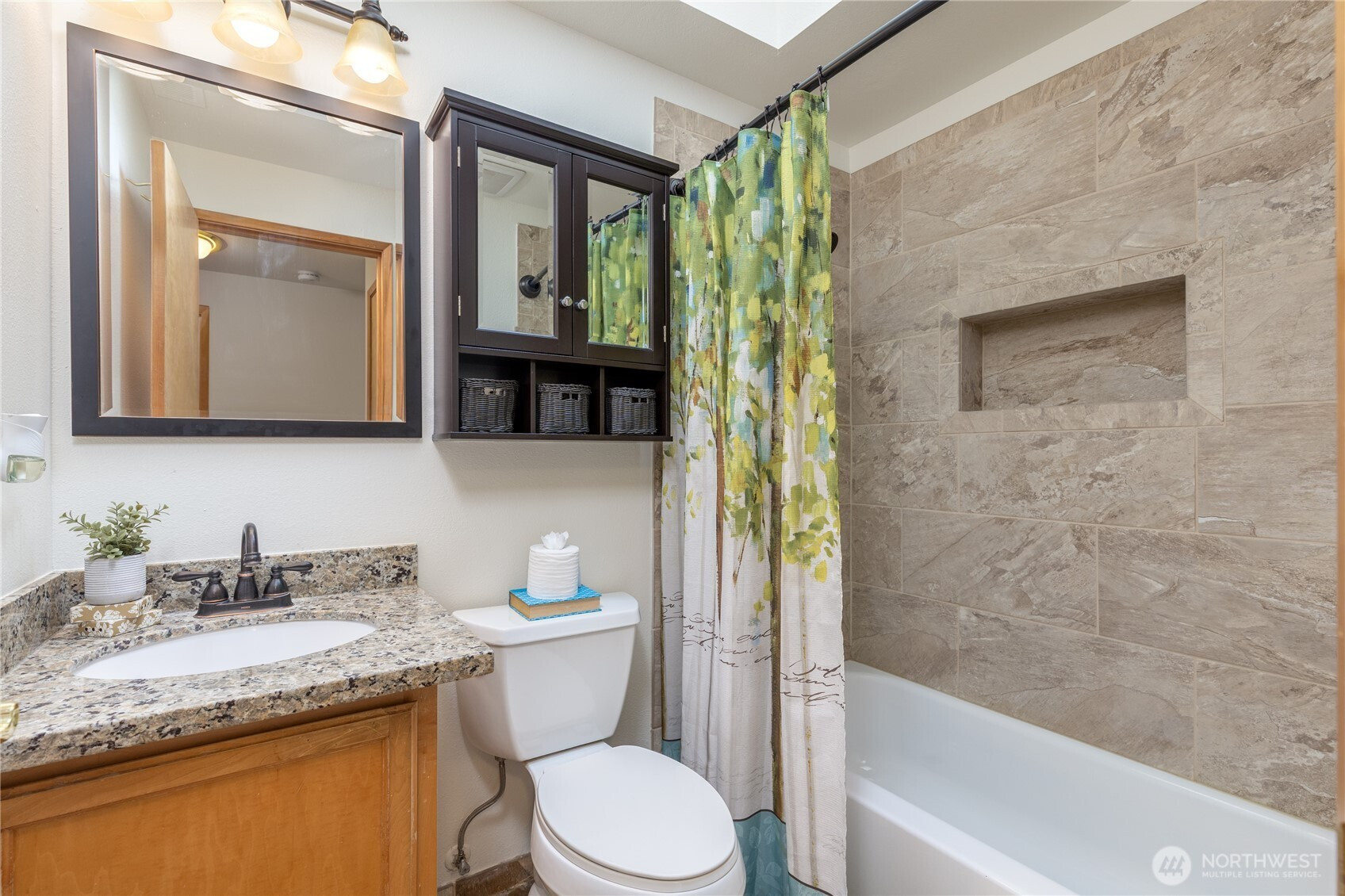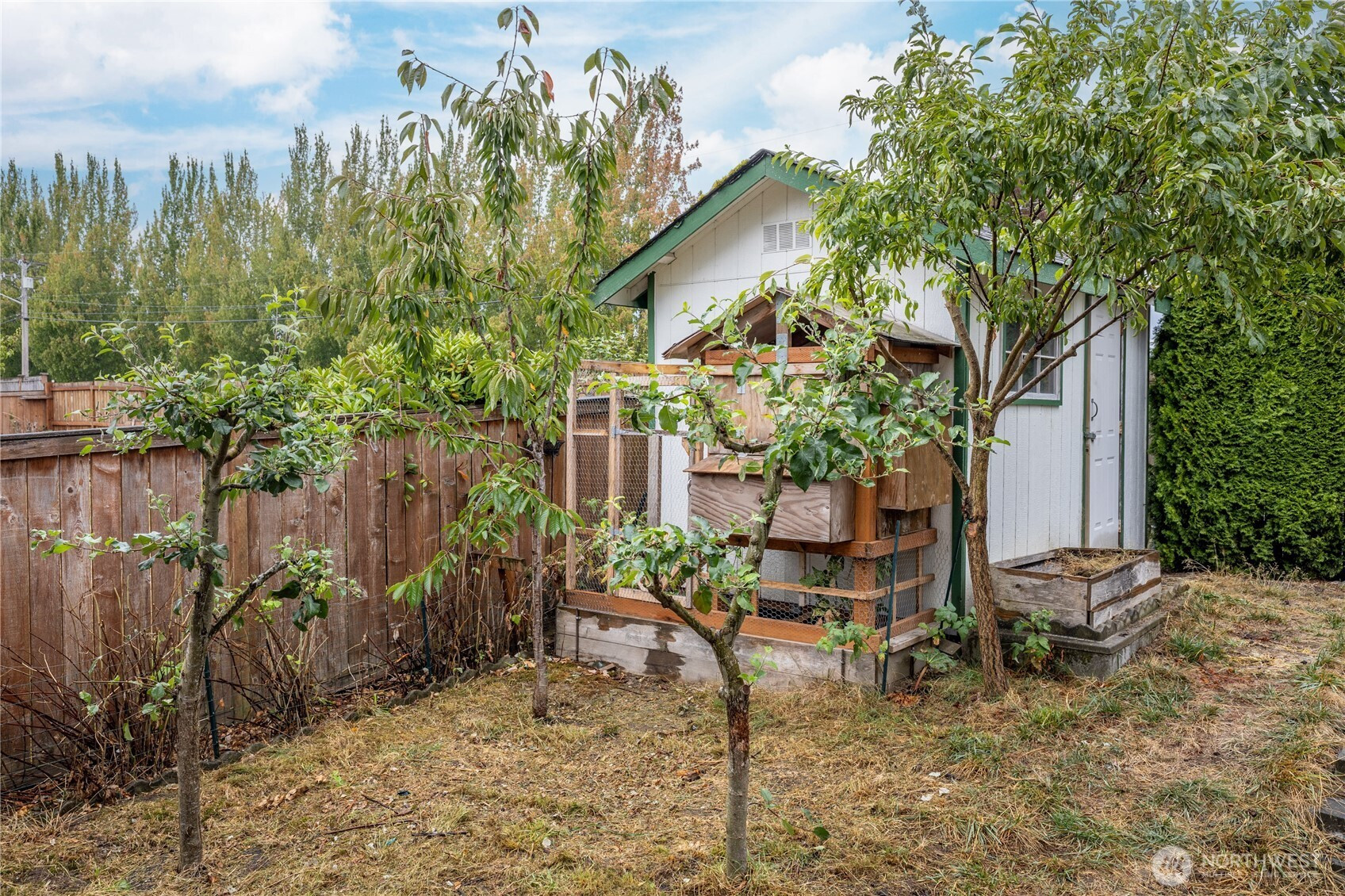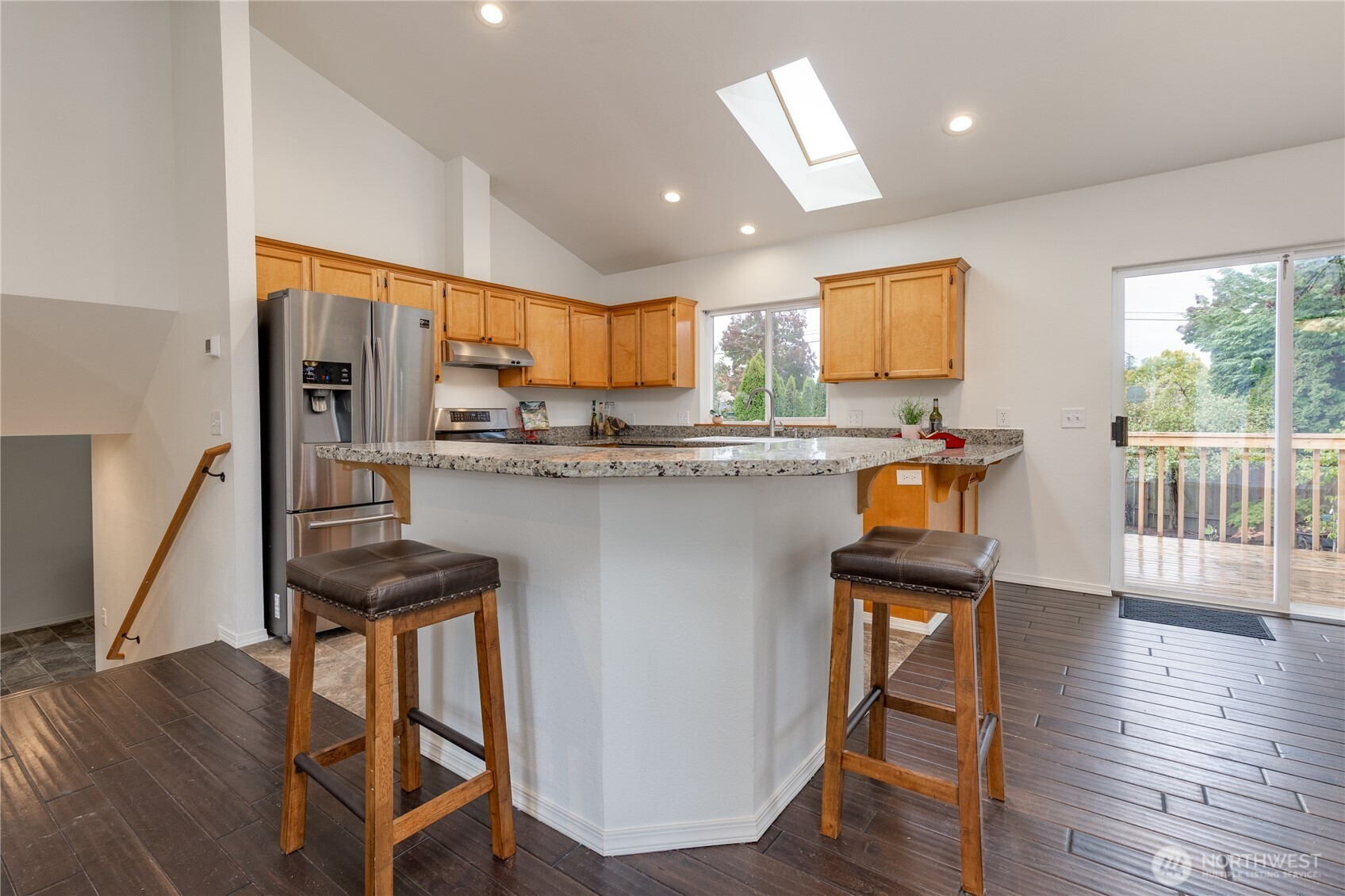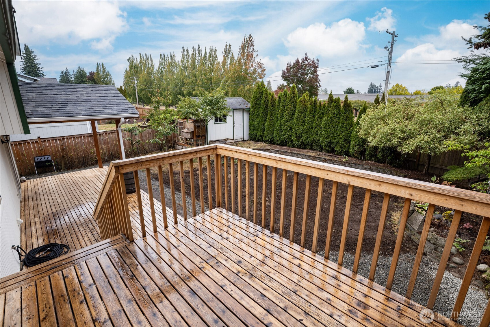 Welcome to the charming Mulberry Lane neighborhood! This updated home offers a bright, open main living area with vaulted ceilings, fresh interior paint, hardwood floors, and a cozy gas fireplace. Large picture windows overlook the beautiful front yard maples. The spacious kitchen features granite counters, stainless appliances & gas range with double oven. The lower-level family room opens to a 2-level covered deck & fully-fenced yard with fruit trees, garden shed & chicken coop. Your primary suite has a private bath with beautifully-tiled shower & dual sinks. Brand-new carpet in all bedrooms. On a large corner lot with mature trees for privacy, plus a fantastic location that's an easy walk to Hazelwood Elementary & Rainier Middle School!