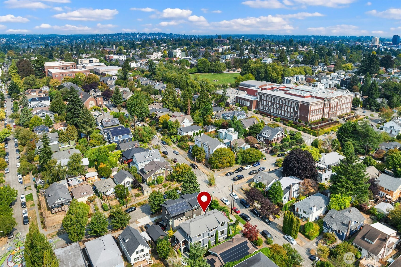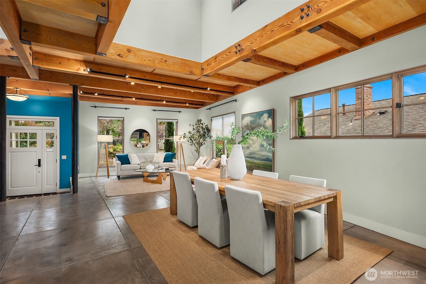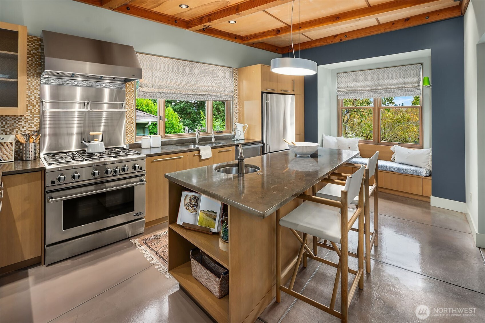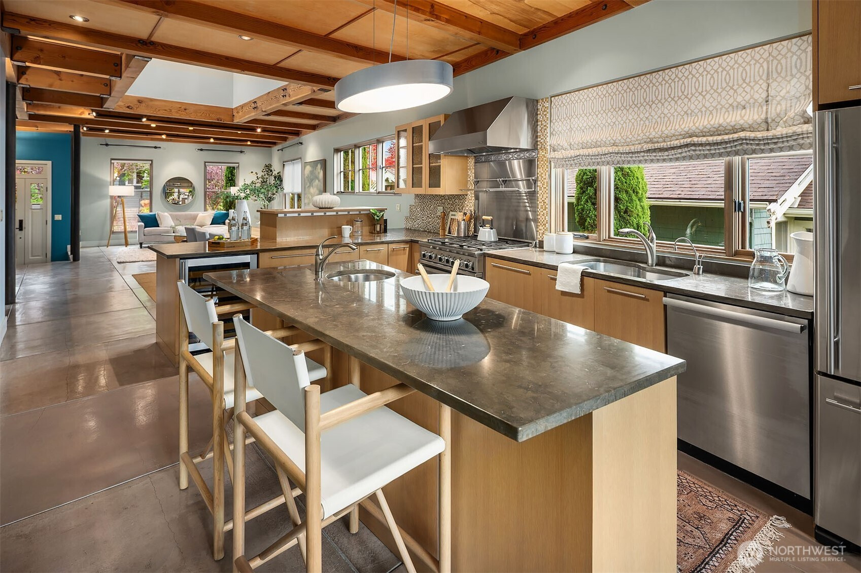 Custom built in 2007, this exquisite Wallingford home delivers exceptional design with unbeatable quality. Fir beams, soaring ceilings, heated concrete floors & abundant windows, create dramatic yet inviting spaces filled with natural light. The chef’s kitchen dazzles with Portuguese limestone counters, rift oak cabinetry, luxury appliances & large island. Step outside to the covered porch & lush gardens featuring a bluestone patio & grill area. The entire 2nd floor is a dreamy primary suite with spa bath, dual walk-ins, laundry & view deck. Exceptional daylight lower level offers 2 bedrooms, bath & media room with garden access. Fab location just steps to Gas Works, Burke Gilman, Wallingford shops & UW. Distinctly custom & undeniably cool!