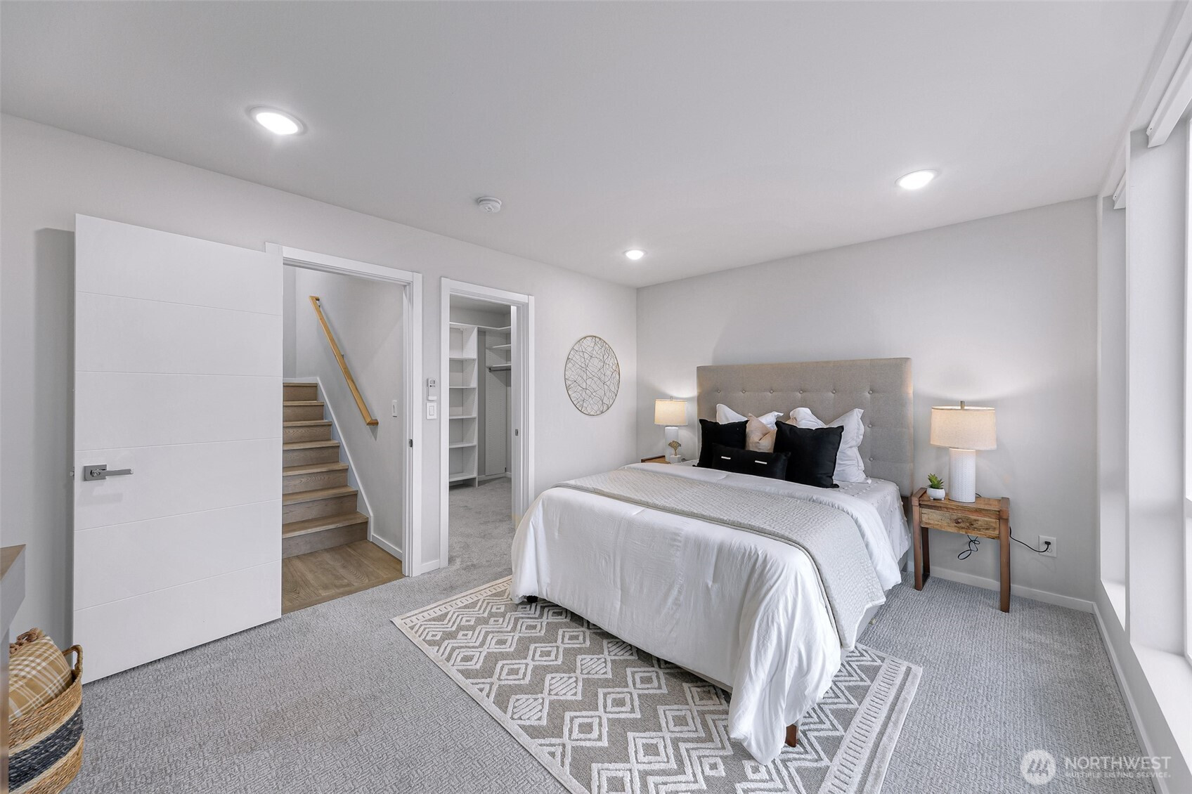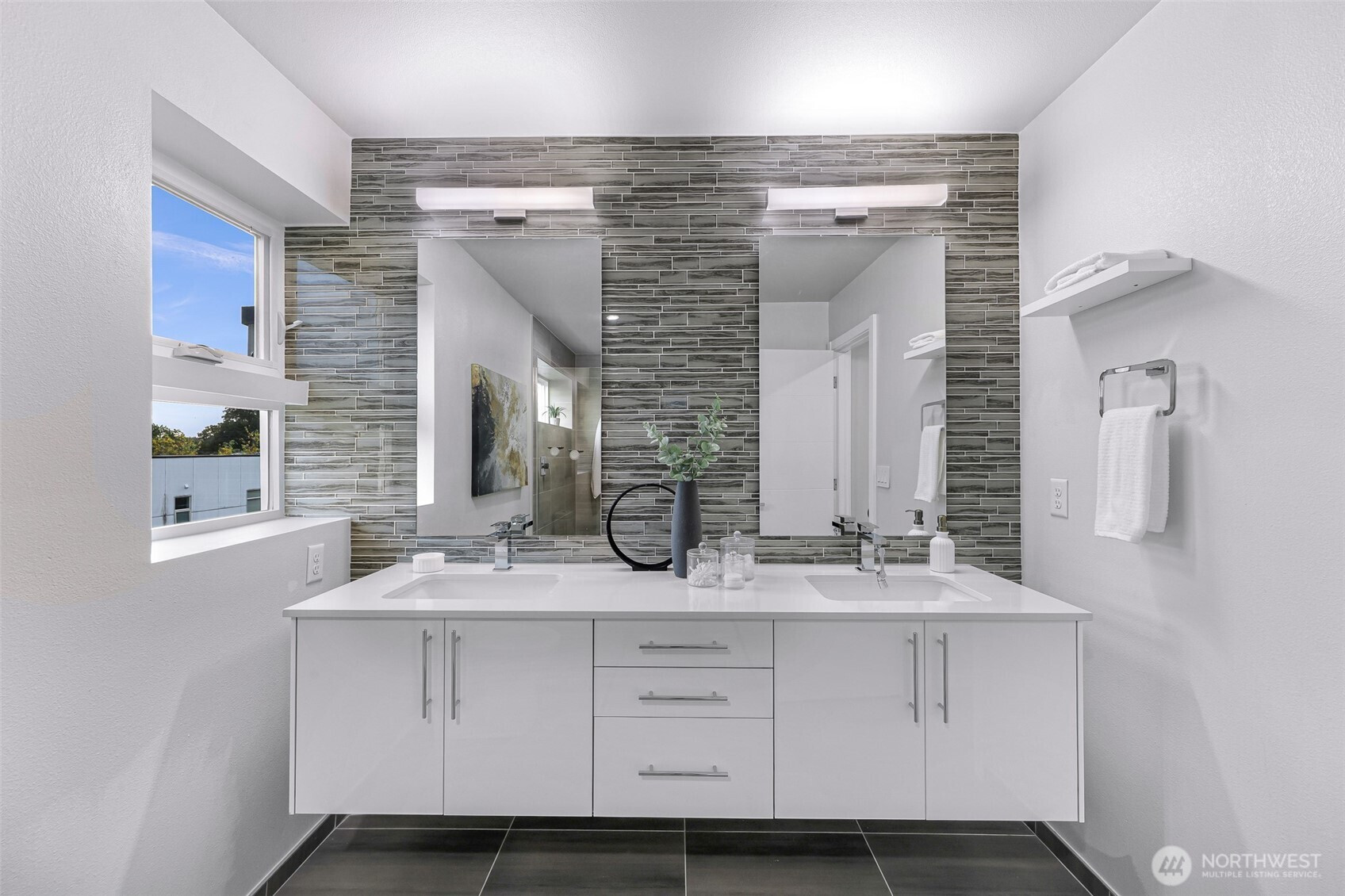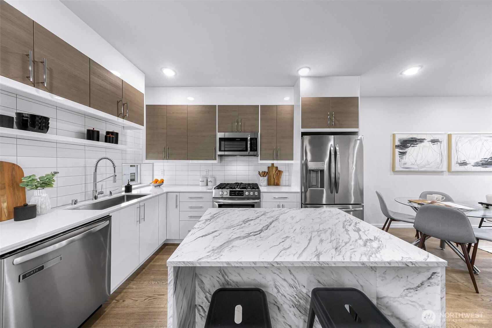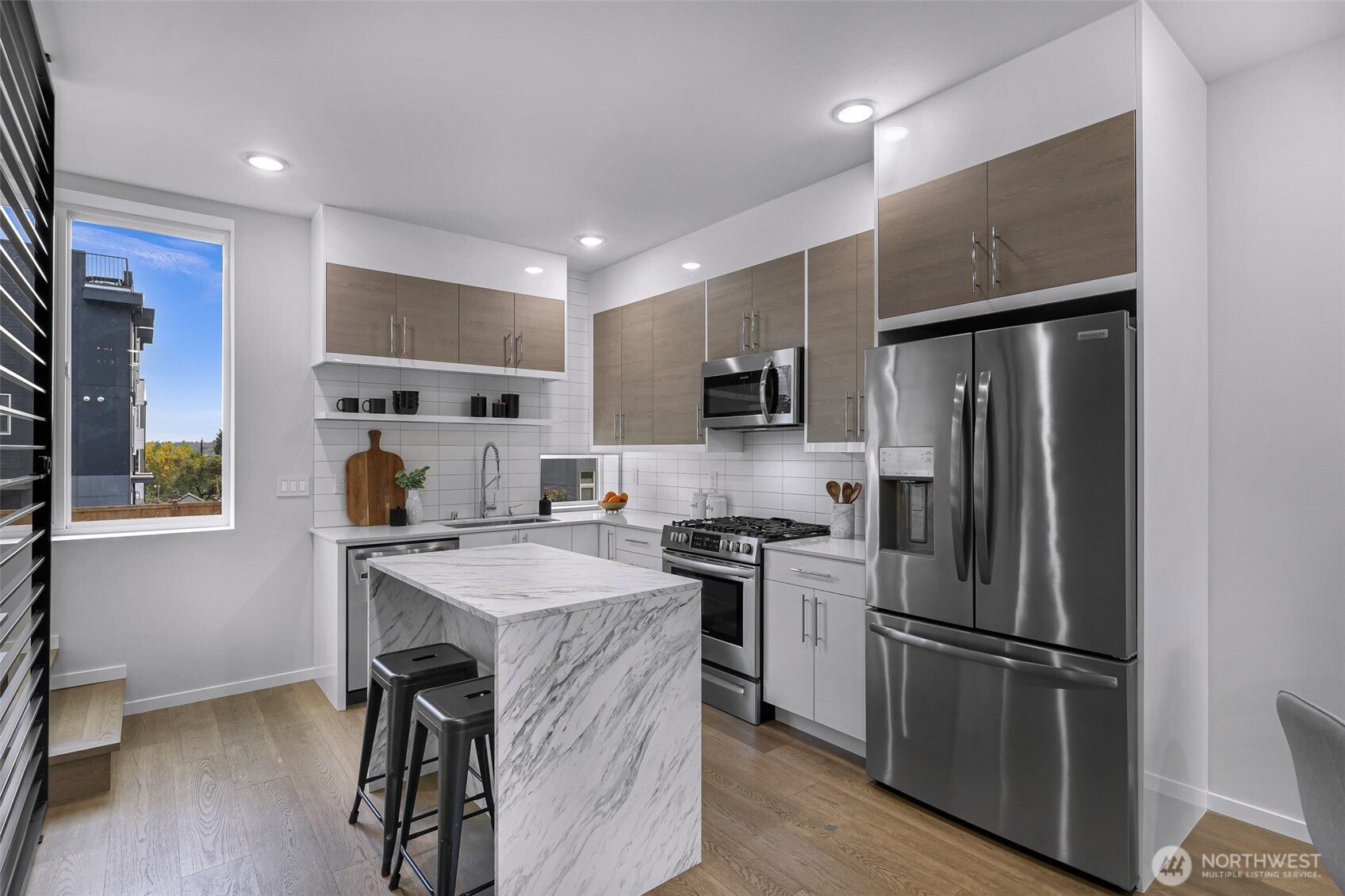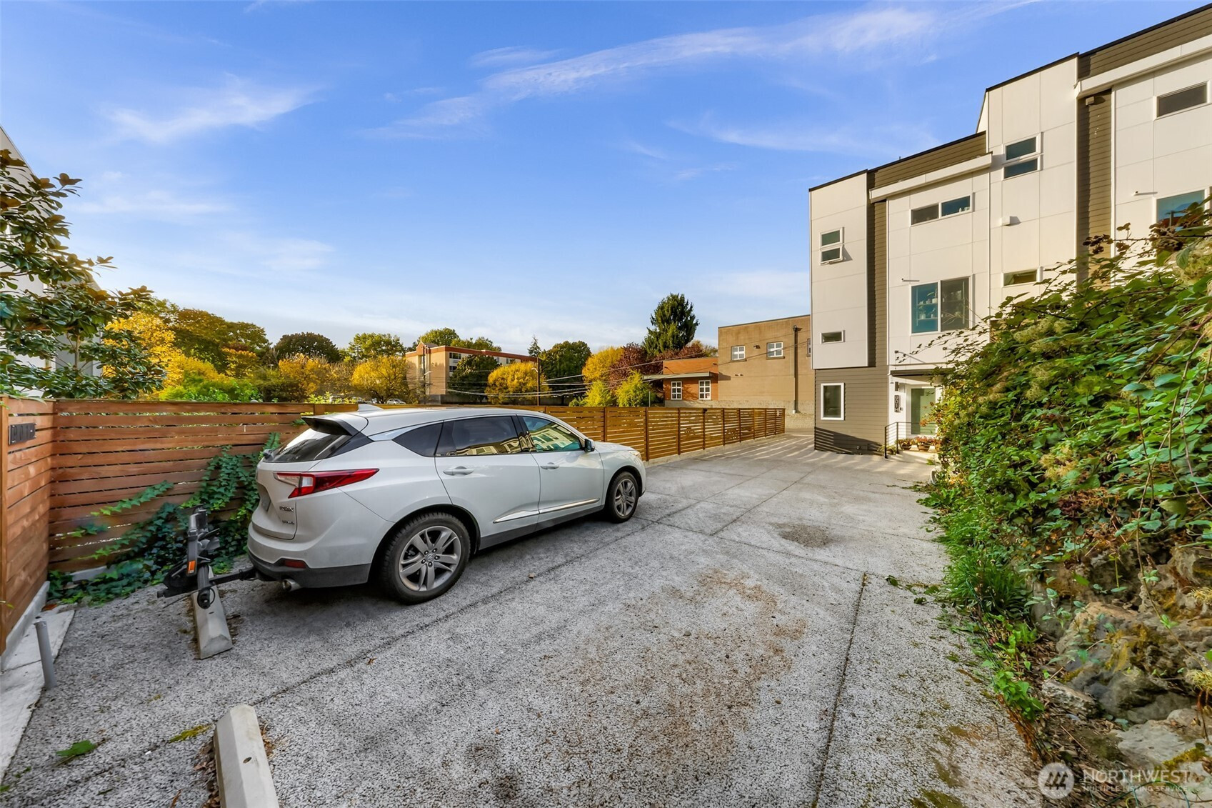 Stunning views, spacious layout, sleek modern finishes + 2 reserved parking spots – built in 2022 & freshly repainted, this 3 bd/2 bth townhouse has it all! Park & find yourself just a few steps from the elevated entry, leading to 2 bdrms + a full bth, & convenient laundry access. Main level offers the perfect open floor plan w/abundant natural light + space for living, dining, & entertaining. Chef’s kitchen w/SS appliances, gas range, an island, & abundant counter space. Upstairs is a beautiful primary suite w/a walk-in closet & spa like en-suite bath. Custom, expansive rooftop deck is perfect for taking in those amazing views. AC throughout, wall to ceiling windows, unmatched design + ideal location near transit, parks, & city amenities!