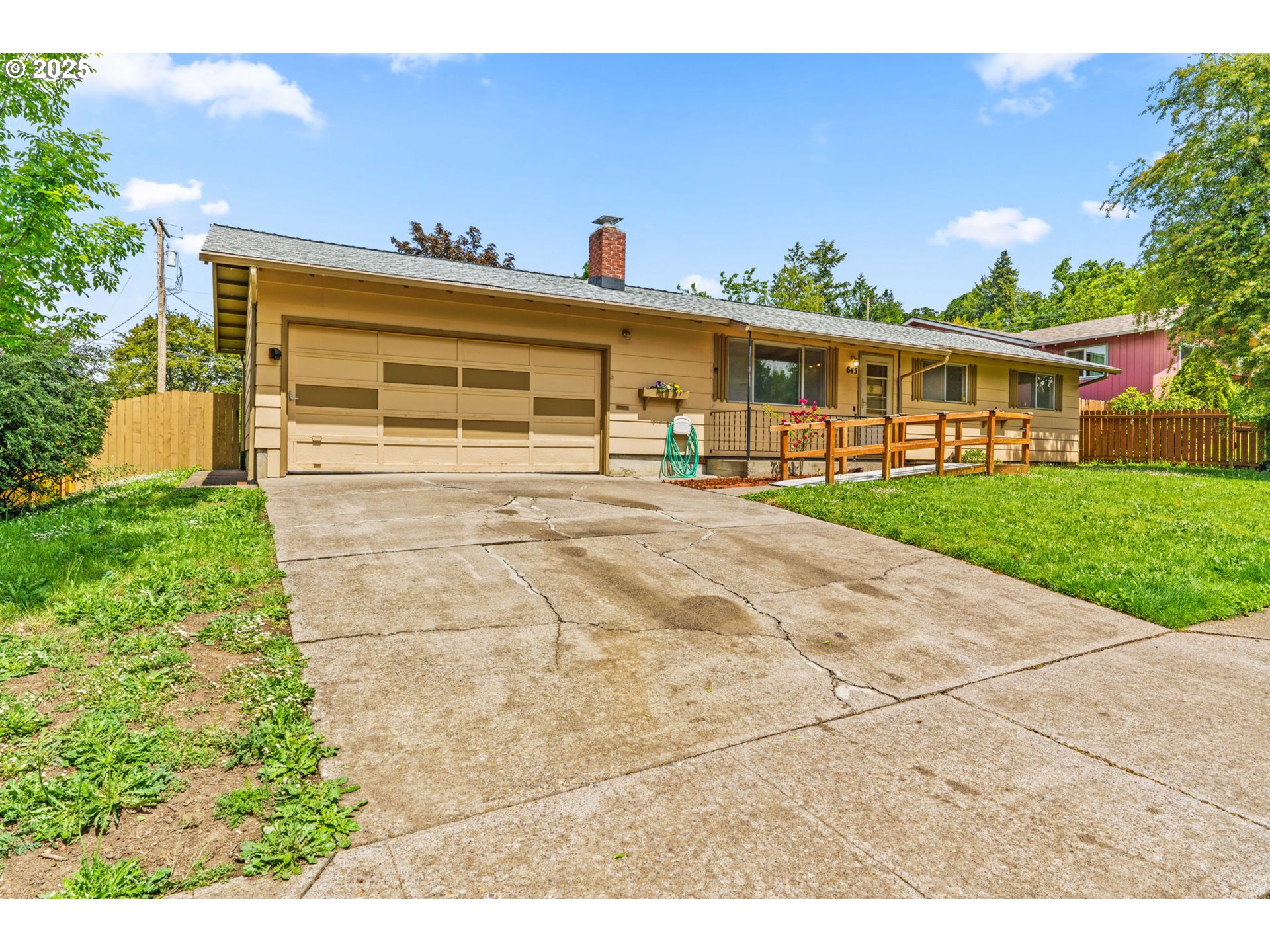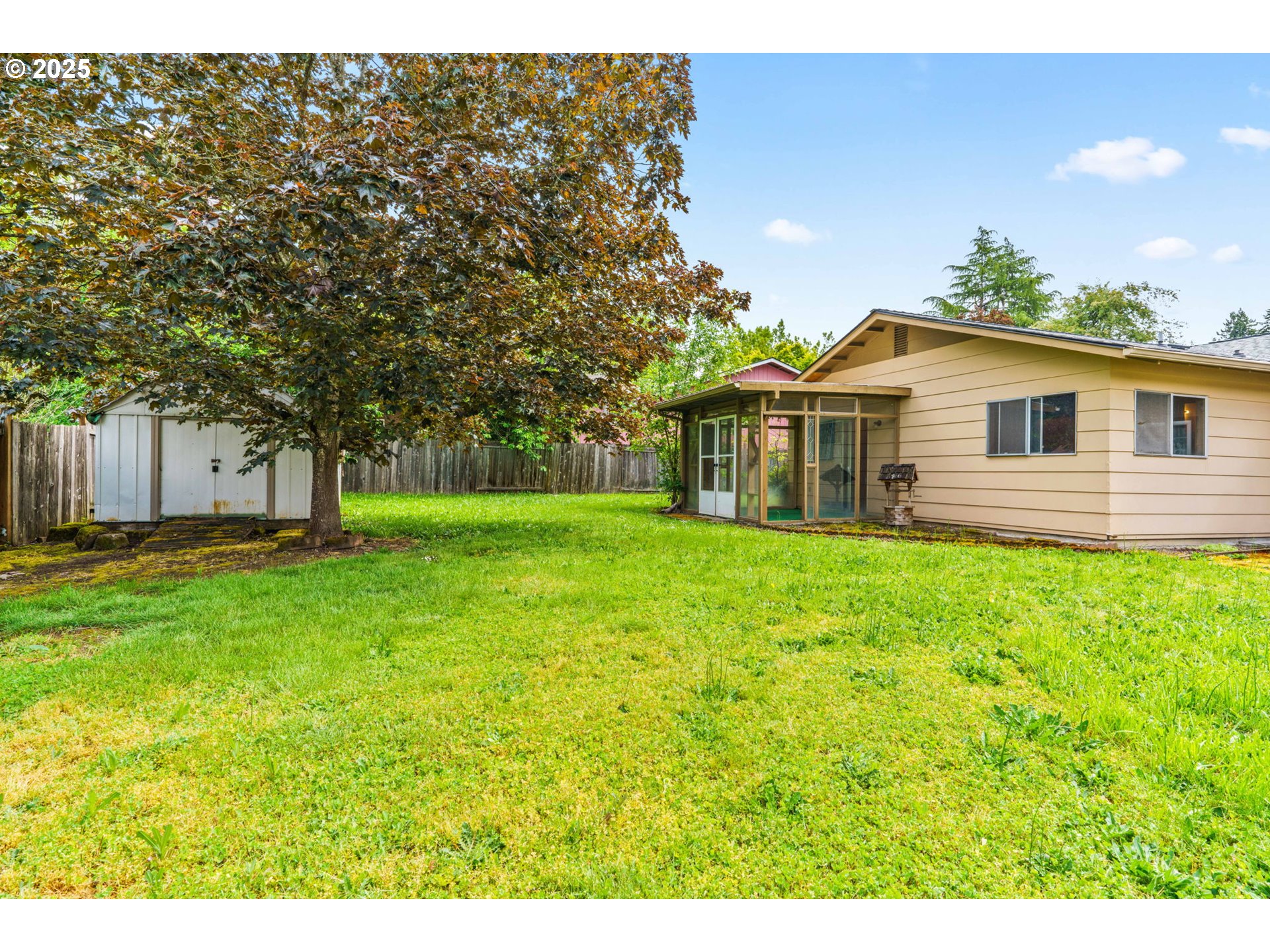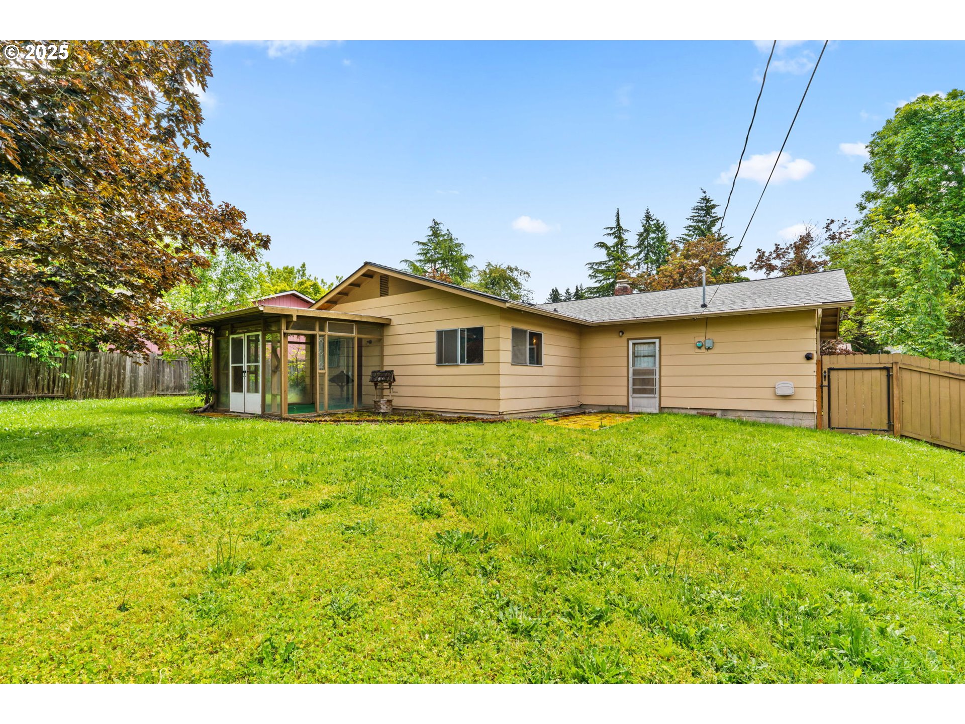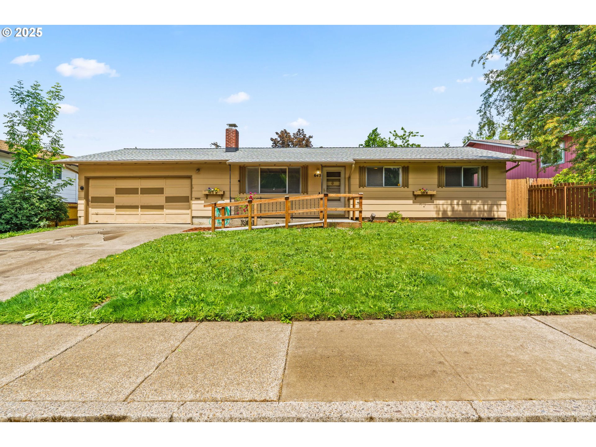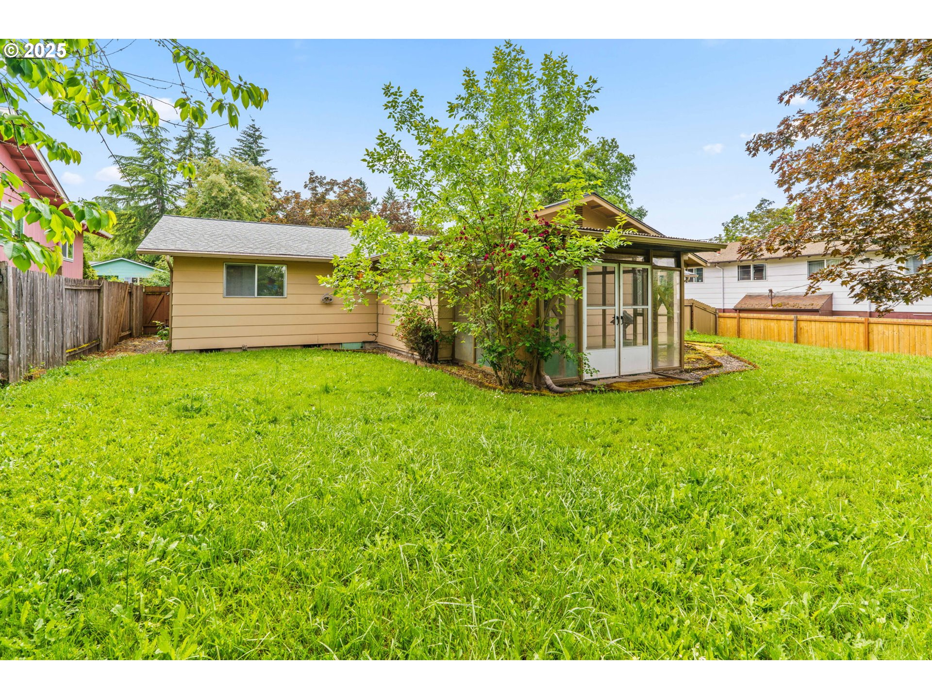 Welcome to this delightful 3-bedroom, 1.5-bath home nestled on a quiet, established street in South Eugene. With 1,404 square feet of space, this well-maintained single-level home offers vintage charm, great bones, and endless potential for your personal touches.The curb appeal is undeniable with its inviting front porch, large picture windows, flower boxes, and a fully accessible ramp leading to the front door. Step inside and you’ll love the warmth of the original hardwood floors and a cozy wood-burning fireplace set against a classic wood-paneled wall—perfect for creating a nostalgic and inviting atmosphere.The spacious living and dining areas feature exposed ceiling beams and retro character, including built-in shelving and a shingle-accented breakfast bar that connects to the kitchen. Speaking of the kitchen—you’ll find abundant cabinet space, a dedicated built-in desk area, and a groovy green vintage range that’s just waiting to be the centerpiece of your retro revival or modern update.Enjoy indoor-outdoor living with a large family room that opens to a covered sunroom, ideal for morning coffee, plant collections, or extra hangout space rain or shine. The fully fenced backyard offers room to roam, a large tree for summer shade, and a handy storage shed.Whether you’re a first-time buyer, a savvy investor, or just someone who appreciates character, this home is bursting with potential. Located minutes from shopping, parks, schools, and UO, this is South Eugene living at an incredible value!