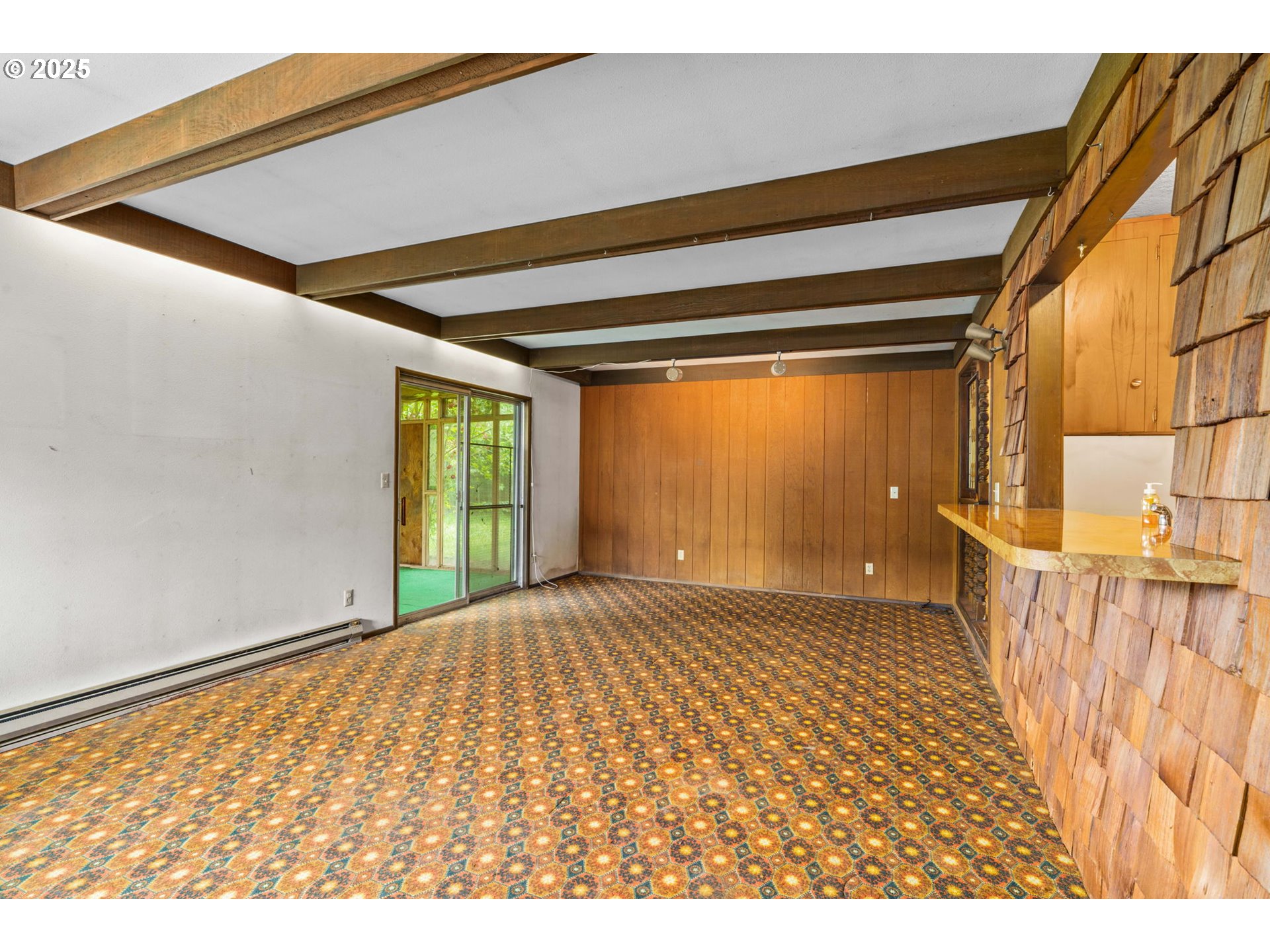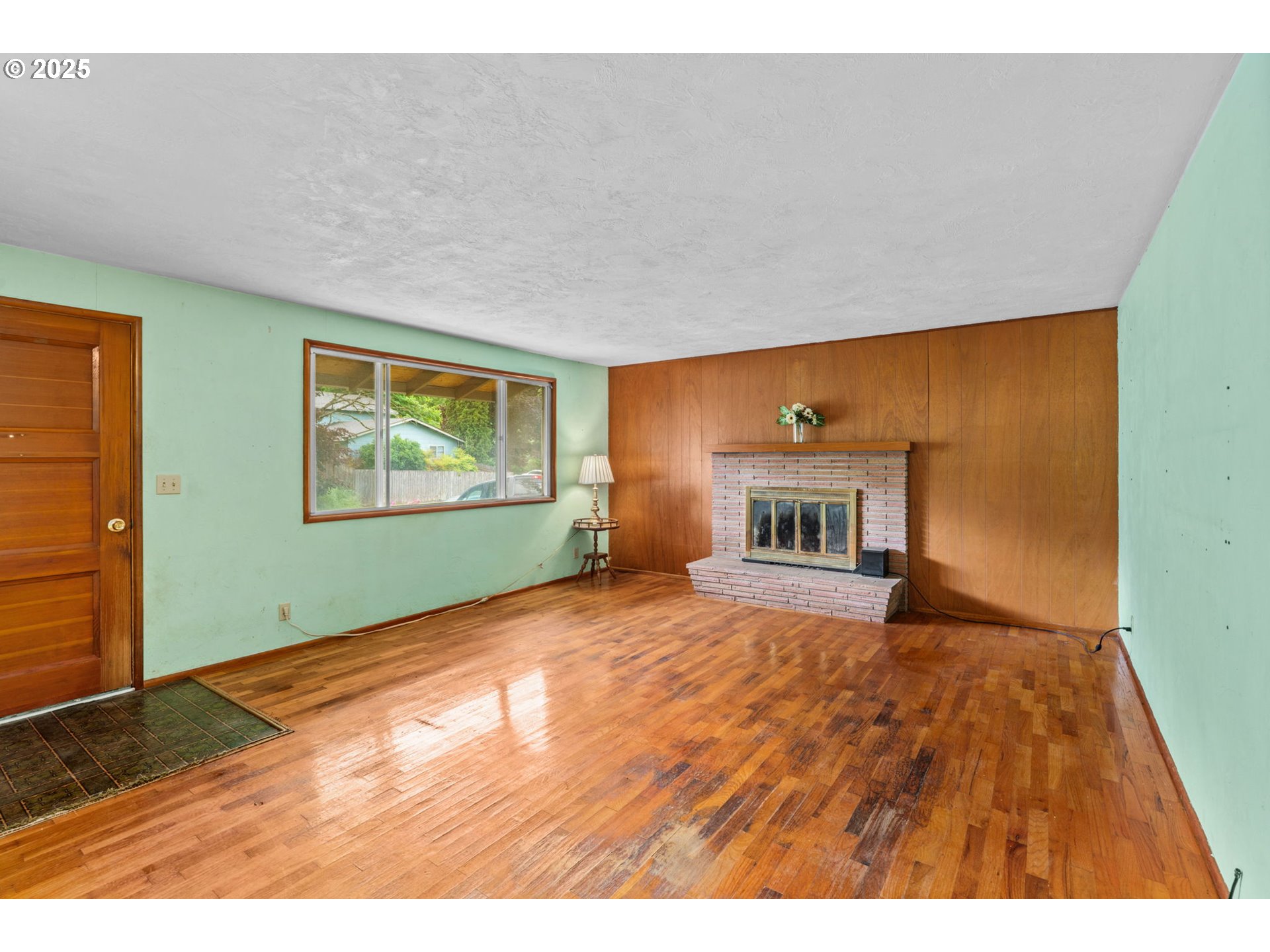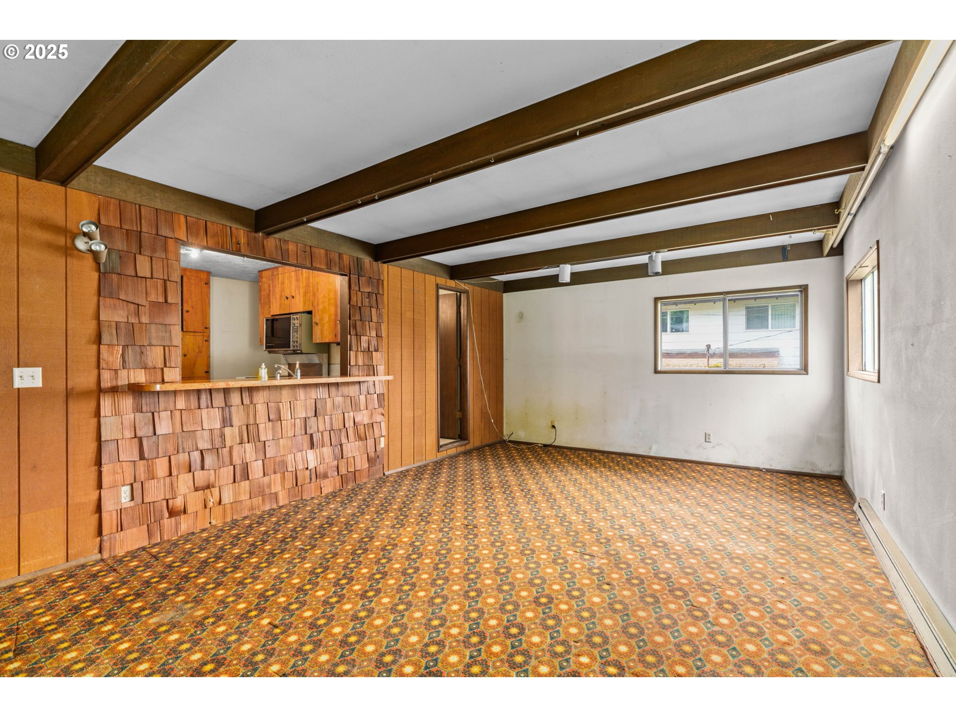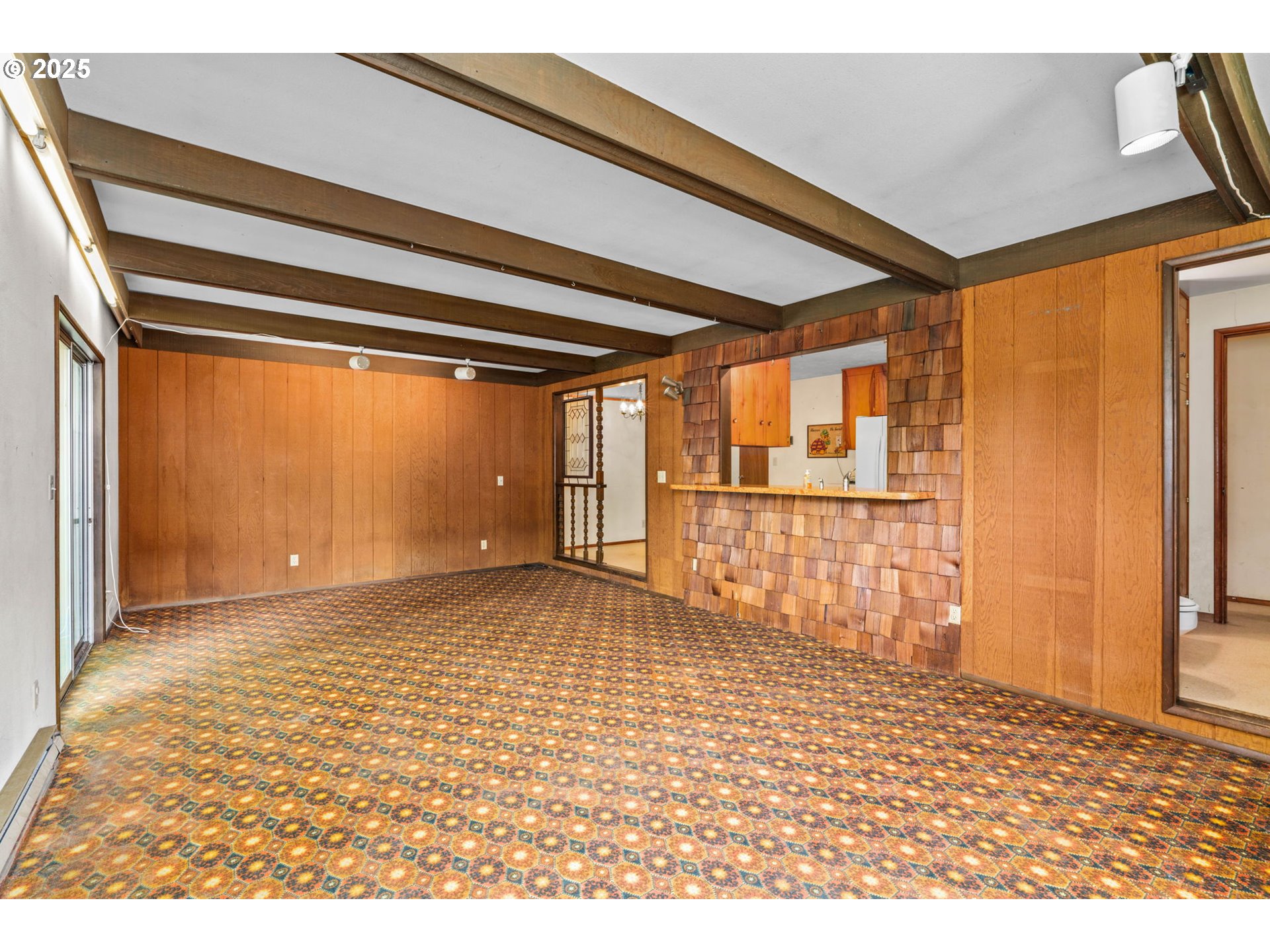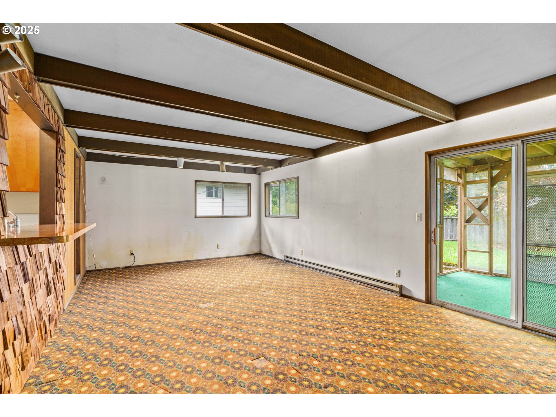 Welcome to this delightful 3-bedroom, 1.5-bath home nestled on a quiet, established street in South Eugene. With 1,404 square feet of space, this well-maintained single-level home offers vintage charm, great bones, and endless potential for your personal touches.The curb appeal is undeniable with its inviting front porch, large picture windows, flower boxes, and a fully accessible ramp leading to the front door. Step inside and you’ll love the warmth of the original hardwood floors and a cozy wood-burning fireplace set against a classic wood-paneled wall—perfect for creating a nostalgic and inviting atmosphere.The spacious living and dining areas feature exposed ceiling beams and retro character, including built-in shelving and a shingle-accented breakfast bar that connects to the kitchen. Speaking of the kitchen—you’ll find abundant cabinet space, a dedicated built-in desk area, and a groovy green vintage range that’s just waiting to be the centerpiece of your retro revival or modern update.Enjoy indoor-outdoor living with a large family room that opens to a covered sunroom, ideal for morning coffee, plant collections, or extra hangout space rain or shine. The fully fenced backyard offers room to roam, a large tree for summer shade, and a handy storage shed.Whether you’re a first-time buyer, a savvy investor, or just someone who appreciates character, this home is bursting with potential. Located minutes from shopping, parks, schools, and UO, this is South Eugene living at an incredible value!