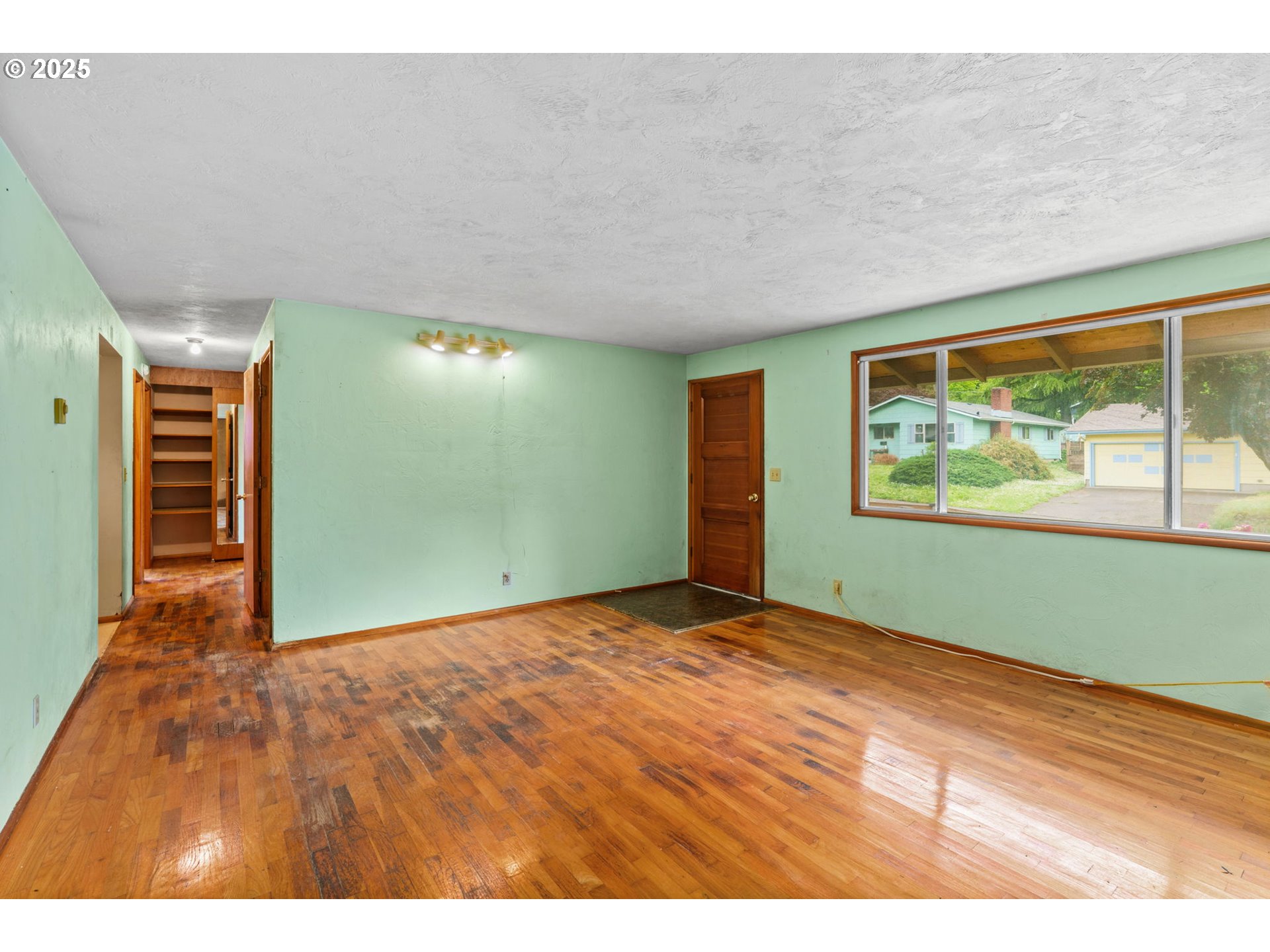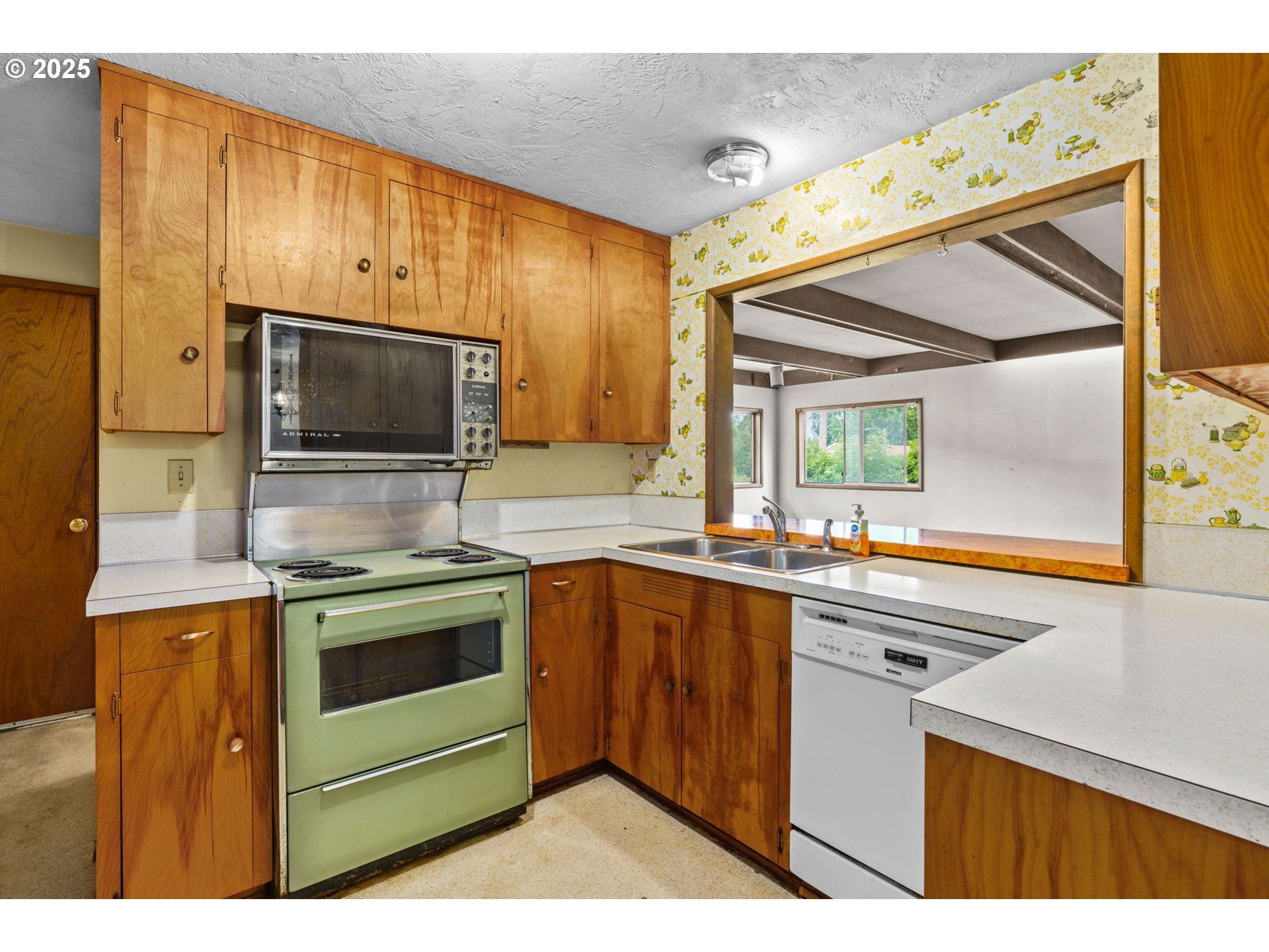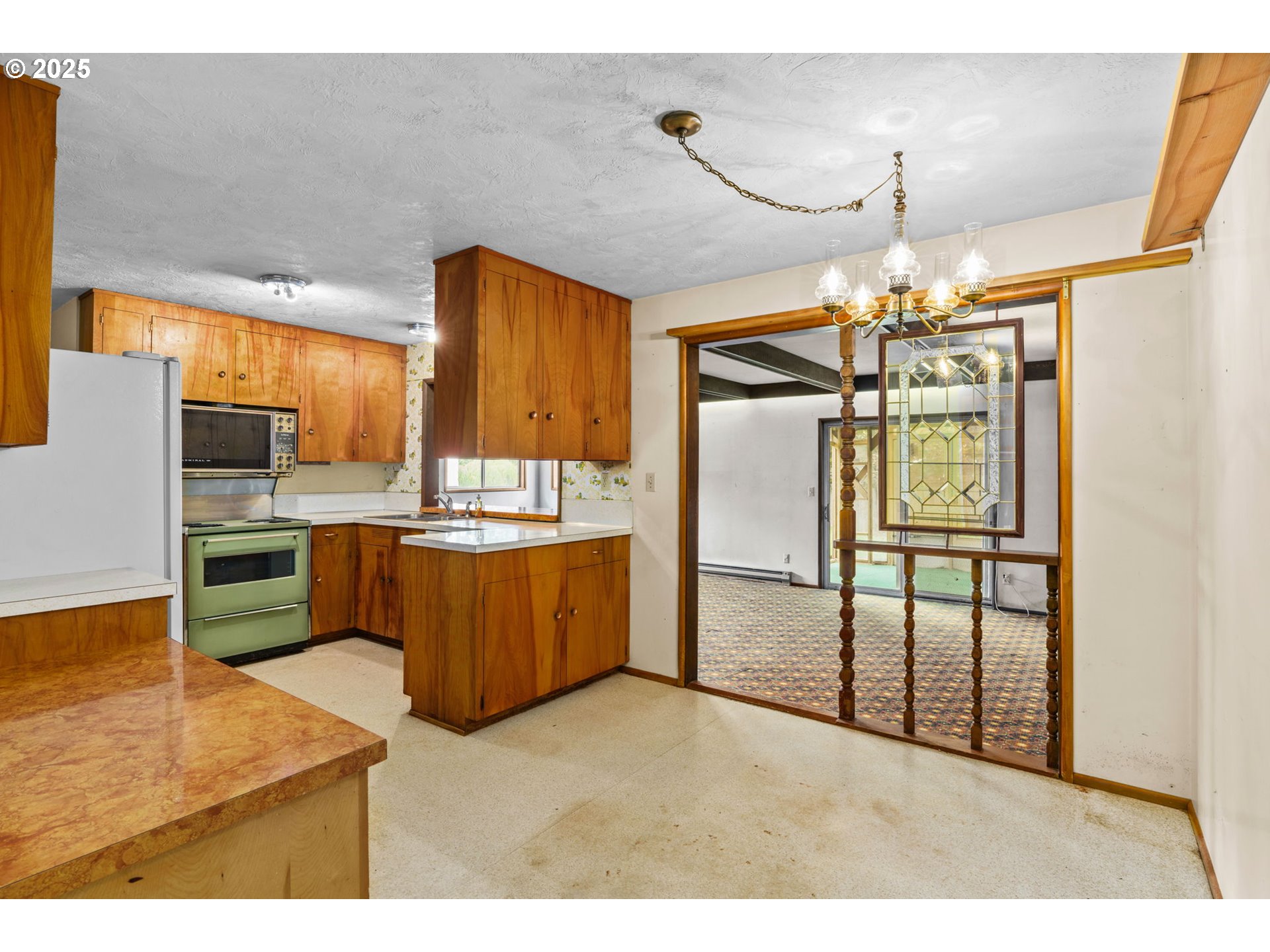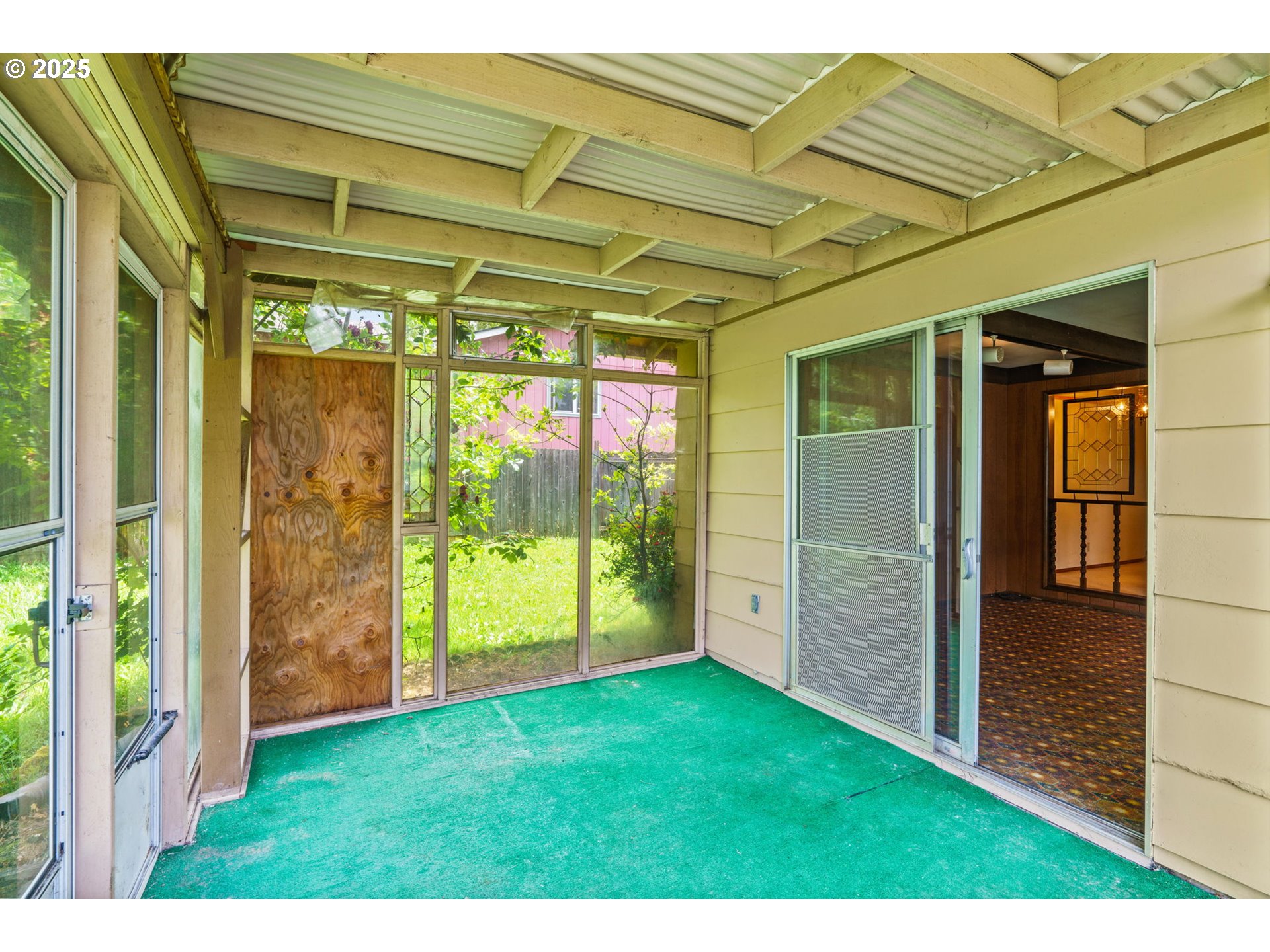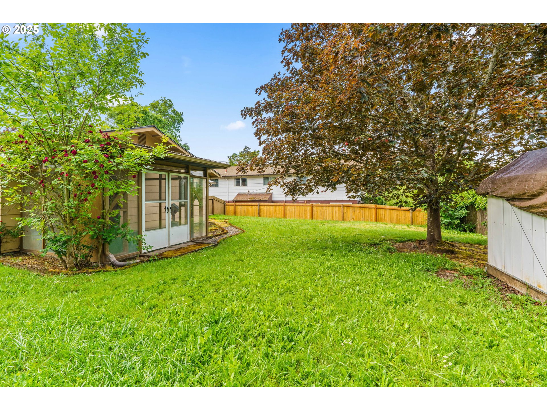 Welcome to this delightful 3-bedroom, 1.5-bath home nestled on a quiet, established street in South Eugene. With 1,404 square feet of space, this well-maintained single-level home offers vintage charm, great bones, and endless potential for your personal touches.The curb appeal is undeniable with its inviting front porch, large picture windows, flower boxes, and a fully accessible ramp leading to the front door. Step inside and you’ll love the warmth of the original hardwood floors and a cozy wood-burning fireplace set against a classic wood-paneled wall—perfect for creating a nostalgic and inviting atmosphere.The spacious living and dining areas feature exposed ceiling beams and retro character, including built-in shelving and a shingle-accented breakfast bar that connects to the kitchen. Speaking of the kitchen—you’ll find abundant cabinet space, a dedicated built-in desk area, and a groovy green vintage range that’s just waiting to be the centerpiece of your retro revival or modern update.Enjoy indoor-outdoor living with a large family room that opens to a covered sunroom, ideal for morning coffee, plant collections, or extra hangout space rain or shine. The fully fenced backyard offers room to roam, a large tree for summer shade, and a handy storage shed.Whether you’re a first-time buyer, a savvy investor, or just someone who appreciates character, this home is bursting with potential. Located minutes from shopping, parks, schools, and UO, this is South Eugene living at an incredible value!