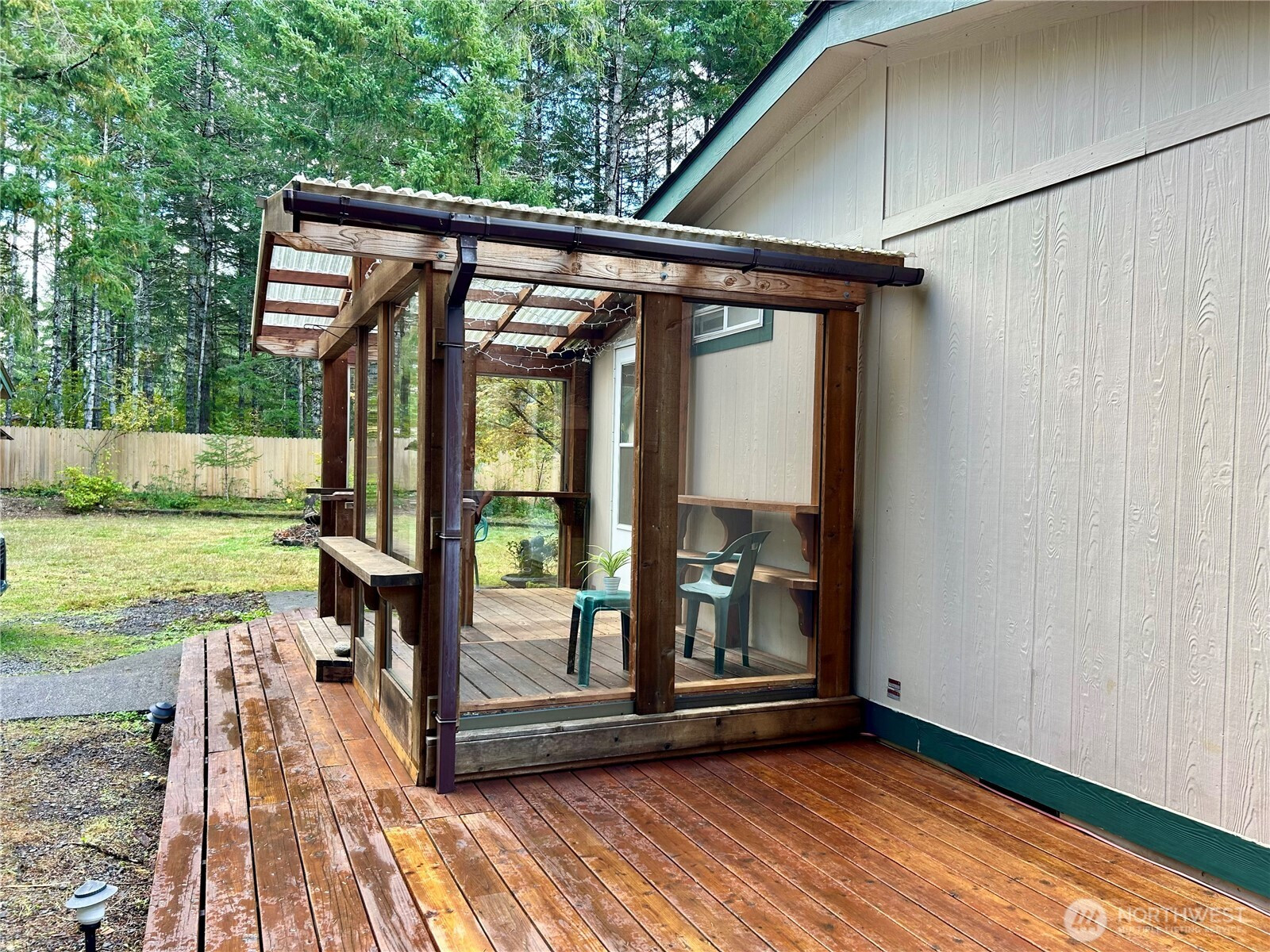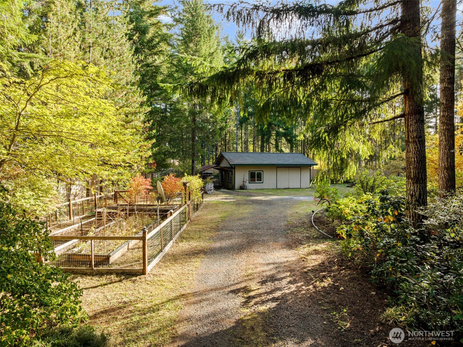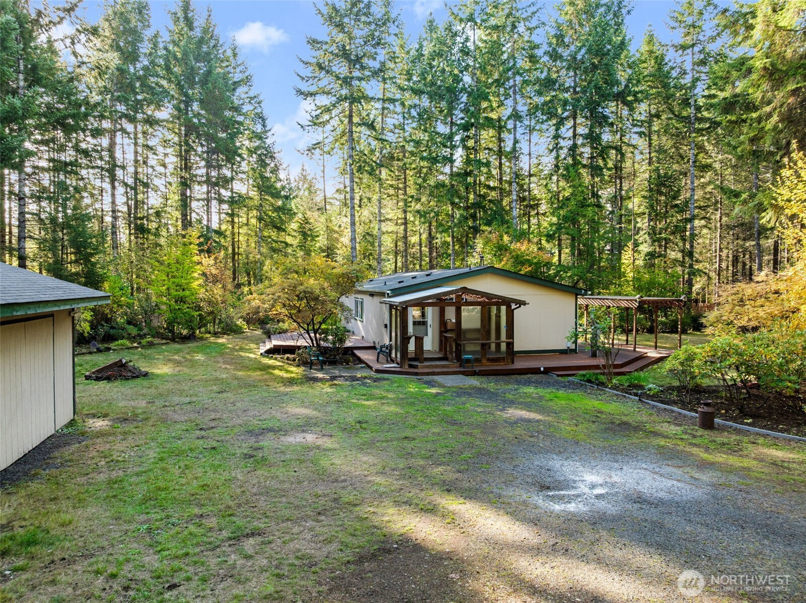 Fully fenced and secluded 1.21-acre parcel with lovely landscape surrounding 3 bedroom, 1.75 bath home. Extensive decking on both sides of home, 720 sf shop/garage with woodstove, 420 sq ft carport and large additional shed + lean to. Home offers ample kitchen with eating bar & built in pantry open to large dining area. Living room with woodstove to keep things cozy, laminate flooring and ceiling fan. Primary bedroom with walk-in + an additional full wall of closets + access to full bath with soaking tub. 2 additional bedrooms and .75 bath. Laundry room with extra storage. Charming, covered access to both front and back doors offer a sweet place to sit and enjoy the private yard. Large garden space and fruit trees.