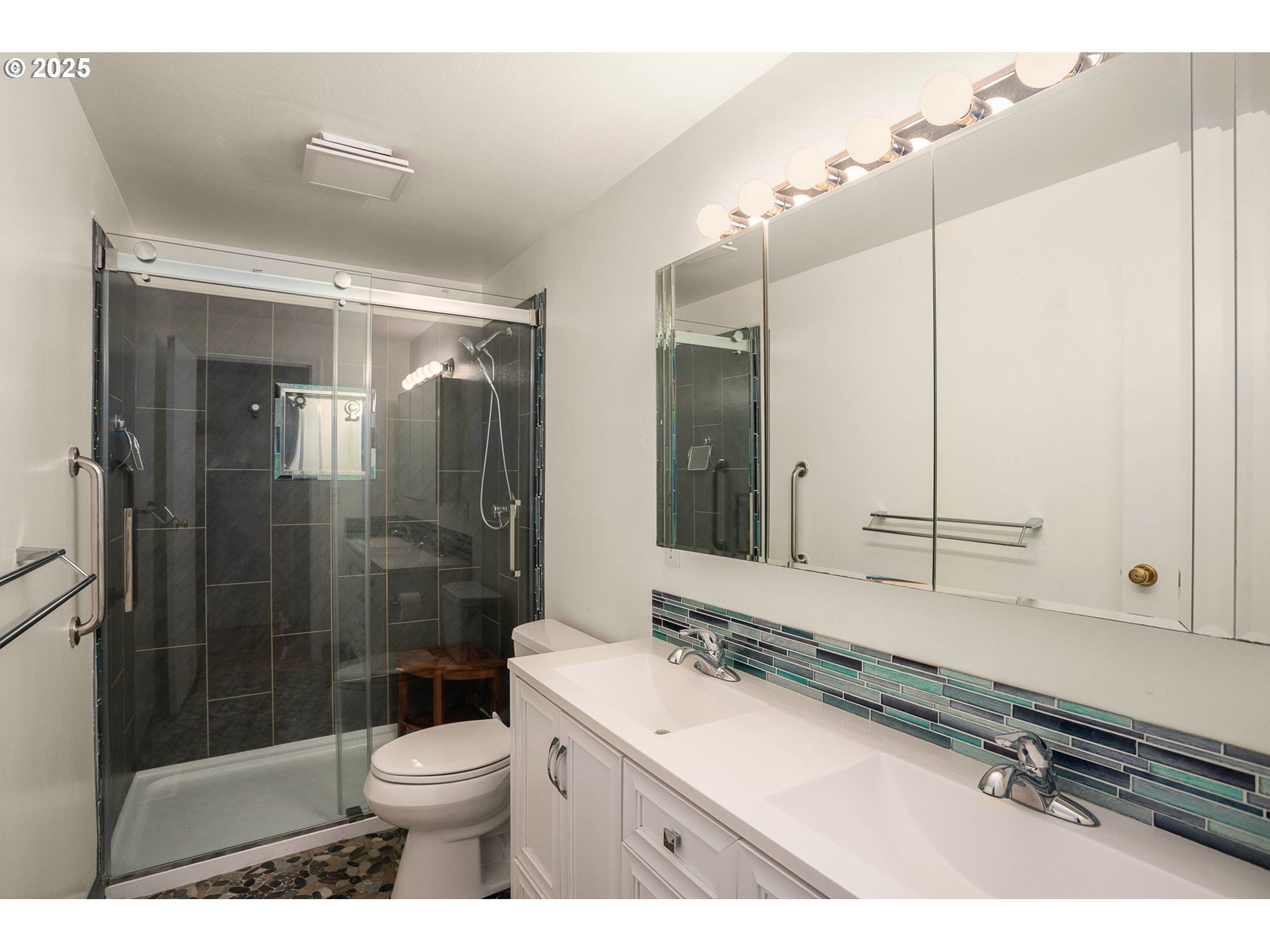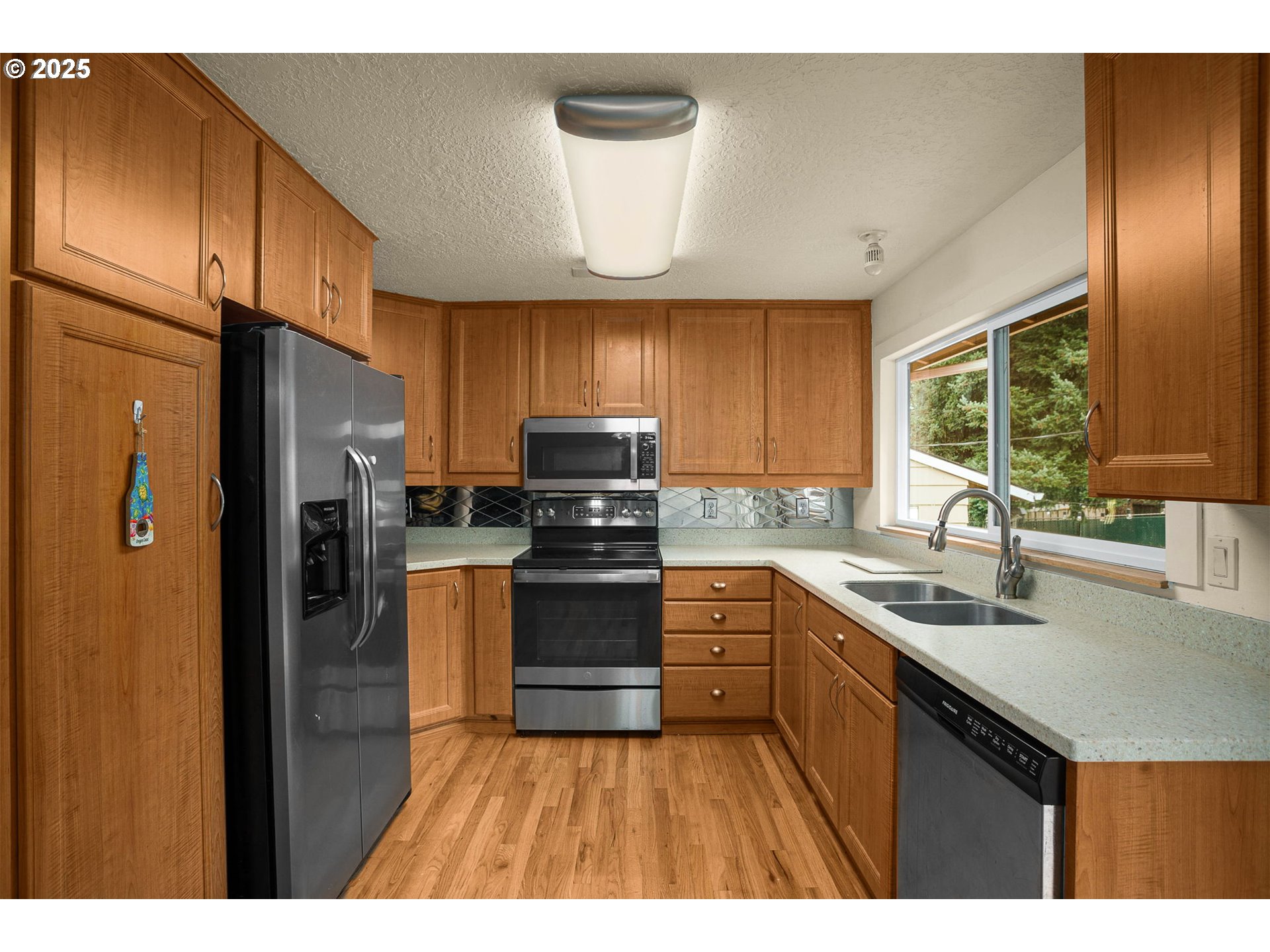 Beautiful split level with view of Powell Butte - updated, clean and move-in ready with an enormous attached 3+ car garage or shop with 240 volt electrical service. No need to worry about maintenance, this one has new furnace, water heater, electrical panel and newer appliances in the kitchen, plus updated cabinets, solid surface countertops, refinished real hardwood floors, and vinyl windows. Great for multigenerational living, with two bedrooms and one bathroom on each level (upstairs bathroom recently updated), plus a living area and spacious laundry room that has access to the backyard. Freshly painted deck off kitchen overlooks spacious backyard with beautiful Powell Butte just beyond. Driveway features RV parking.
