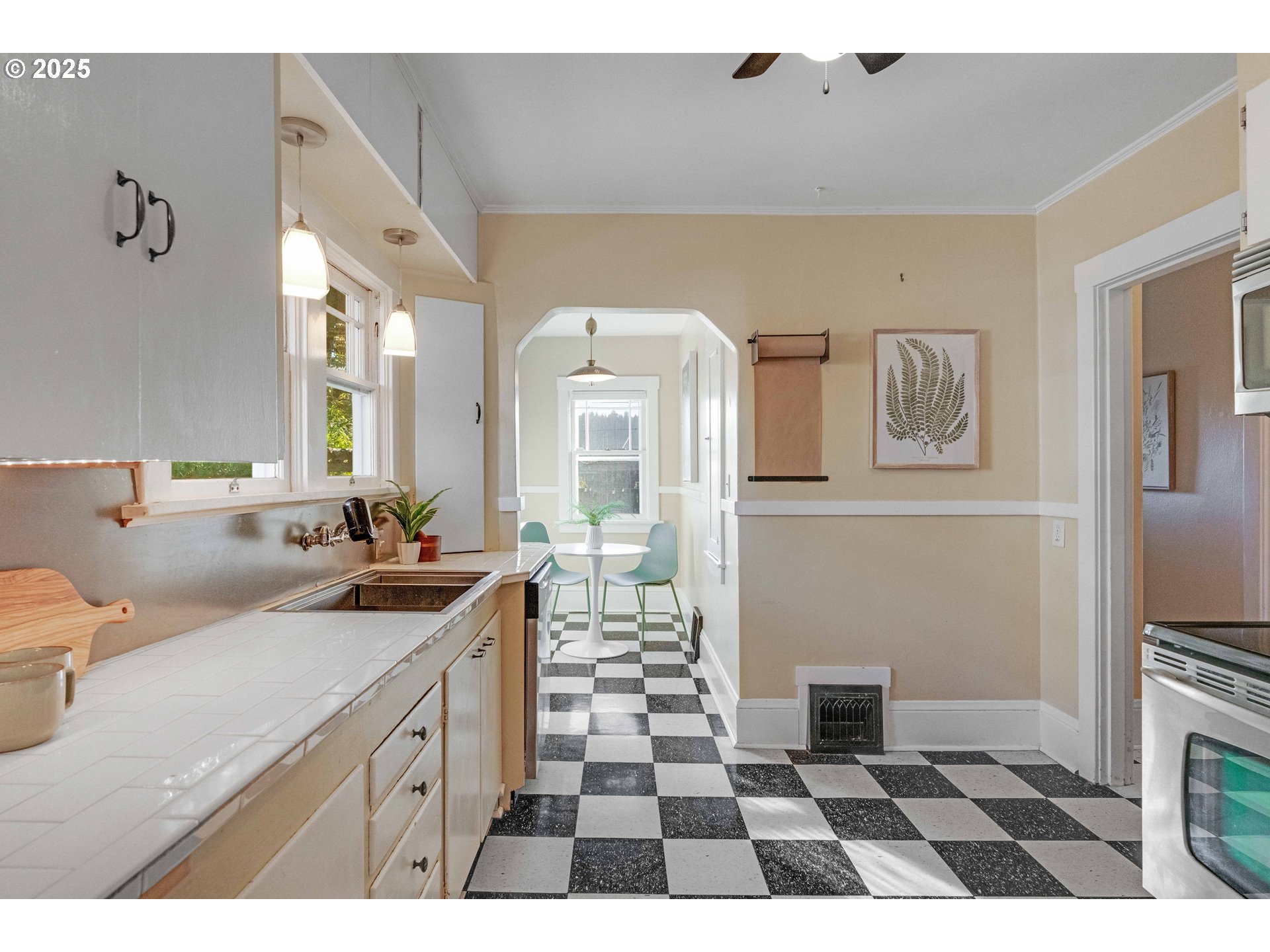 This beautifully maintained Roseway home is filled with vintage charm and modern updates throughout, offering flexibility and comfort in a classic setting. Fresh exterior paint and newly refreshed landscaping with sod, barkdust, and plantings enhance its curb appeal. Inside, hardwood floors, built-ins, and a clawfoot tub highlight timeless craftsmanship. Major updates include a roof, gutters, and furnace (2015), an earthquake retrofit (2016), and energy-efficient vinyl windows. Stainless steel appliances, a two-car garage, fenced yard, and ample off-street parking add everyday convenience. Currently used as a two bedroom/large primary suite with double closets or convert back to a three bedroom. Large basement with tall ceilings and possibility to finish and create more living space. Just blocks to Glenhaven Park and Rose City Golf Club. With its covered front porch and move-in-ready condition, this Roseway gem perfectly blends character and care. [Home Energy Score = 7. HES Report at https://rpt.greenbuildingregistry.com/hes/OR10183212]