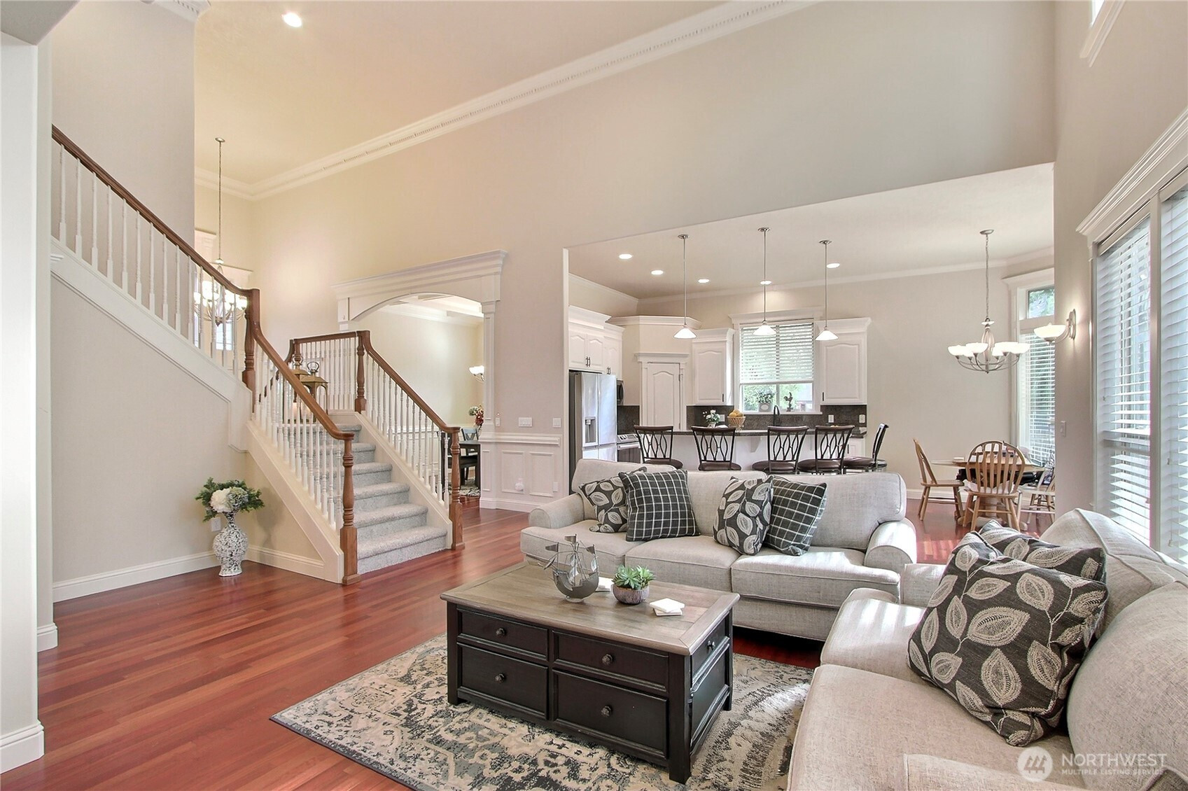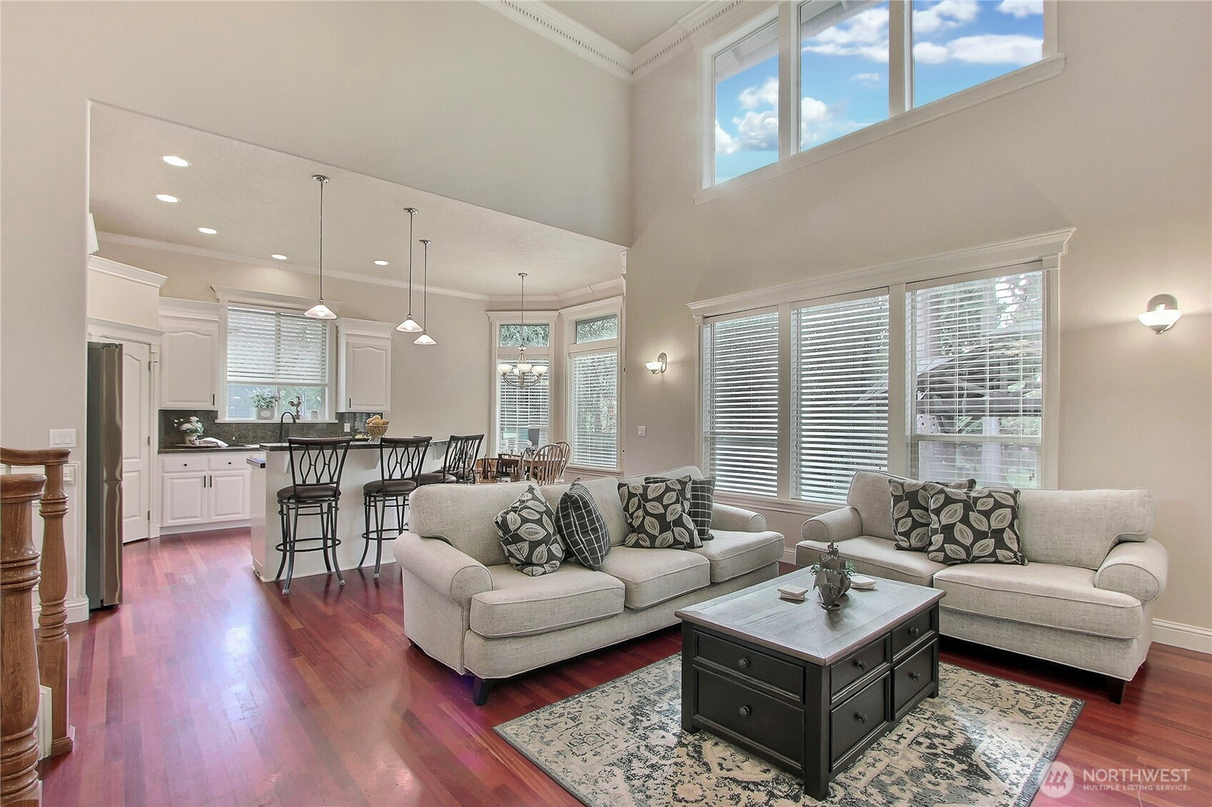 Explore timeless elegance! Bold architectural lines greet you with soaring 18’ ceilings, rich Brazilian cherry hardwoods, and intricate crown molding—setting the stage for stylish luxury. The main-floor primary suite is a private sanctuary, featuring tranquil greenbelt views, a marbled spa-inspired bath, and direct access to the serene backyard. A striking double-sided staircase draws the eye upward to a secluded upper wing with three spacious bedrooms and a versatile bonus room. Here, sophistication meets everyday comfort—in truly unforgettable style. Embrace spacious living and peaceful greenbelt views, all wrapped in an exquisite design where luxury and comfort unite.