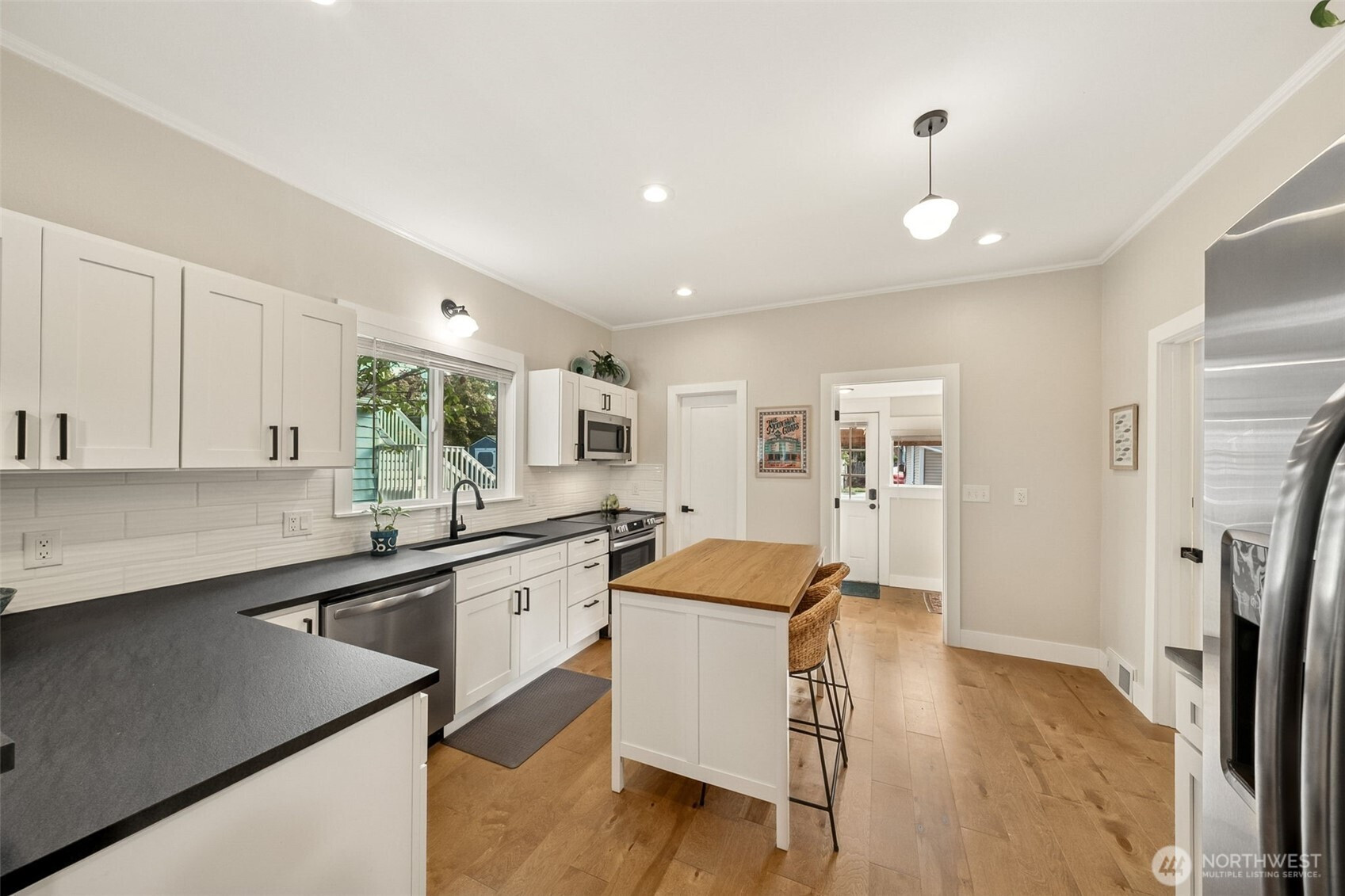 Just steps from Point Defiance Park & Point Ruston- this fully remodeled Craftsman offers the perfect blend of charm & convenience. Featuring 2 bedrooms plus a versatile upstairs space that could function as a 3rd bedrm, the primary suite boasts an attached ¾ bath. Recent upgrades incl. a NEW roof, LVP flooring, new paint/stain, new fencing, updated electrical, vinyl windows, & stainless steel appliances. The kitchen shines w/ quartz countertops & a walk-in pantry, while ample closets & built-ins provide great storage. Outside, enjoy a fully fenced backyard, fruit trees, RV parking, & an expansive 2 car garage w/alley access. Relax on the covered front porch & enjoy the serene Ruston lifestyle, a peaceful retreat that truly feels like home.