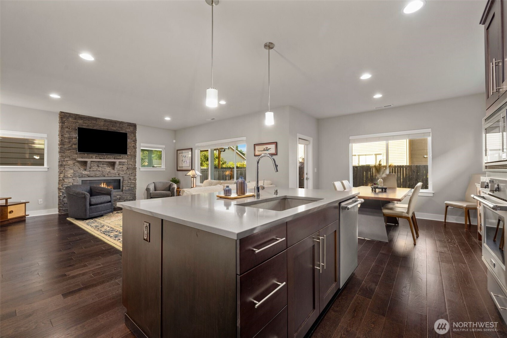 Built in 2018, this contemporary Ryan Park home welcomes you with radiant natural light and rich espresso-toned hardwoods that sweep across the open main floor. A sleek kitchen with quartz countertops, full-height tile backsplash, and pantry flows effortlessly into the dining area and fenced backyard—an inviting setting for al fresco entertaining. The living room’s stacked-stone fireplace forms a warm centerpiece, while upstairs, a spacious bonus room and tranquil primary suite offer everyday retreat. With over $65K in upgrades, the home showcases expanded hardwoods, backyard hardscaping, and an upgraded garage with epoxy floors and custom storage. Just steps from a community park and within the sought-after Northshore School District.