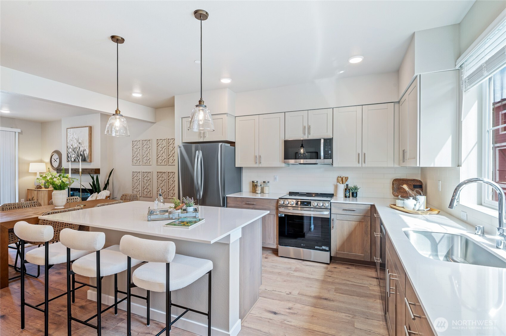 Welcome to Aberdour Landing, a beautifully crafted new community in Bothell where style meets everyday ease. Lot 5 offers 4 bedrooms and 3.5 baths, including a generous entry-level suite with private bath—ideal for guests or versatile living. The main floor shines with a walk-in pantry, oversized kitchen island, and a dedicated tech niche for work or study. Thoughtful upgrades include a cozy fireplace, heated balcony, stair lighting, and a Ring doorbell for modern convenience. Complete with a car charger outlet, and the timeless classic color scheme, this home blends comfort, elegance, and functionality. Community subject to site registration policy.