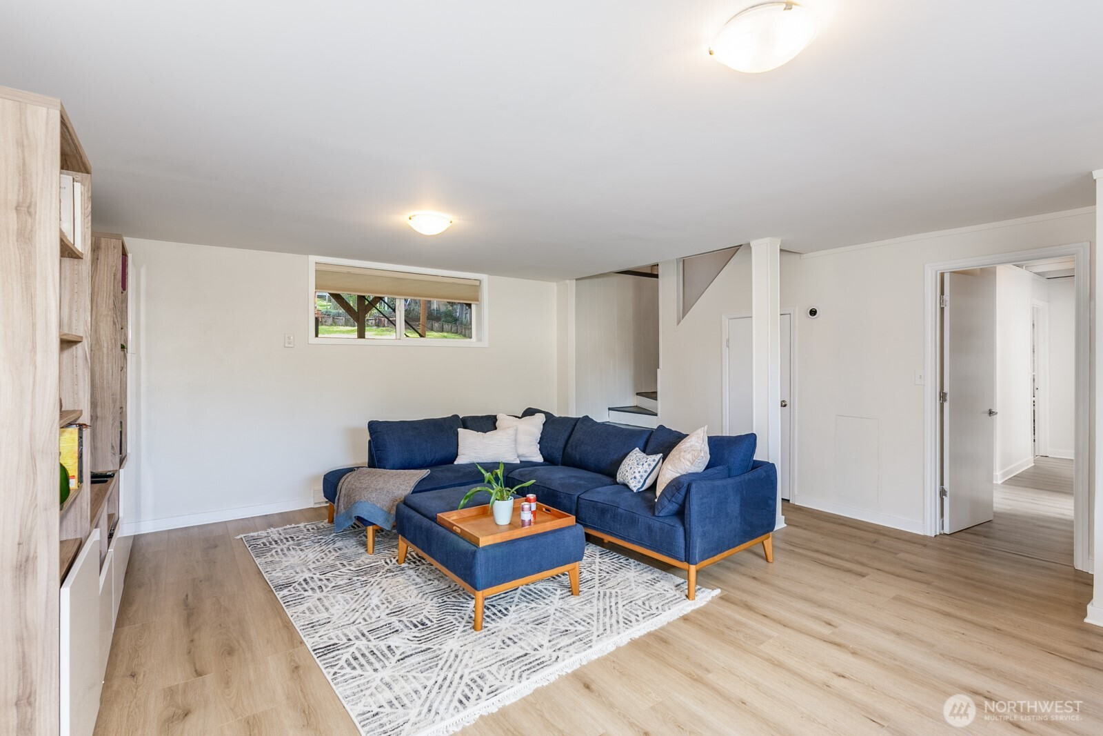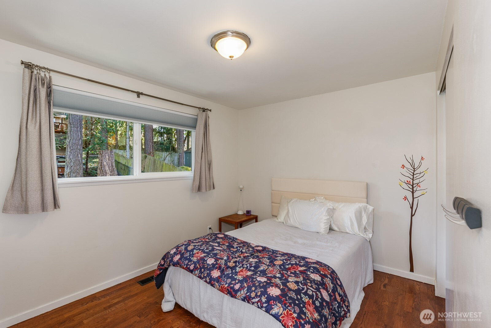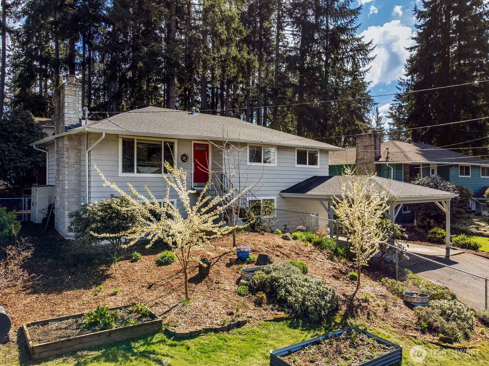Welcome home to this beautifully updated 2,042 sq ft residence offering 5 bedrooms and 1.75 baths with a versatile, well-designed layout. You’re greeted by rich hardwood floors and a warm wood fireplace that flows seamlessly into a bright, open living and dining area. The kitchen features stainless steel appliances and opens to a spacious deck, perfect for entertaining or relaxing outdoors. The main level includes three bedrooms, including a comfortable primary, while the finished lower level offers two additional bedrooms, a bath, laundry area, and a generous second living space with its own wood fireplace. Outside, enjoy fruit trees, raised garden beds, a patio ideal for gatherings, a cozy firepit, and an outbuilding for extra storage—all complemented by a brand new roof and gutters.