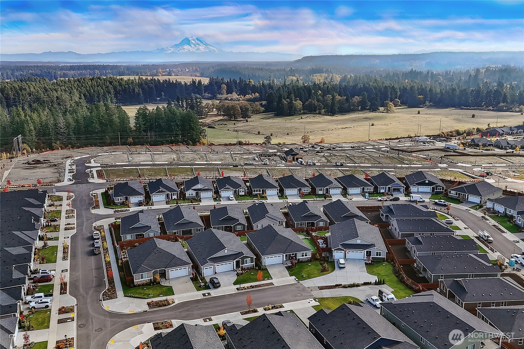 NEW ON MARKET! Turn-key home in the desired 55+ community of Ovation at Oak Tree. This 2 bed + Den/office home offers easy single level living with no-step entry & quality finishes throughout. Enjoy wide planked LVP flooring, quartz counters, ultra-glide blinds, additional storage cabinets, plus a heat pump! Spa like primary bath with dual sinks, tiled shower, & large walk-in closet. Situated on a corner lot, the backyard is a showstopper with gorgeous landscaping, a soothing fountain, raised garden beds, low maintenance turf, pavers, plus an oversized covered patio...all with a Mt Rainier view! Active lifestyle community with trails & clubhouse, all situated on a 40-acre Oak Preserve. Perfect blend of comfort, style, and peaceful living!
