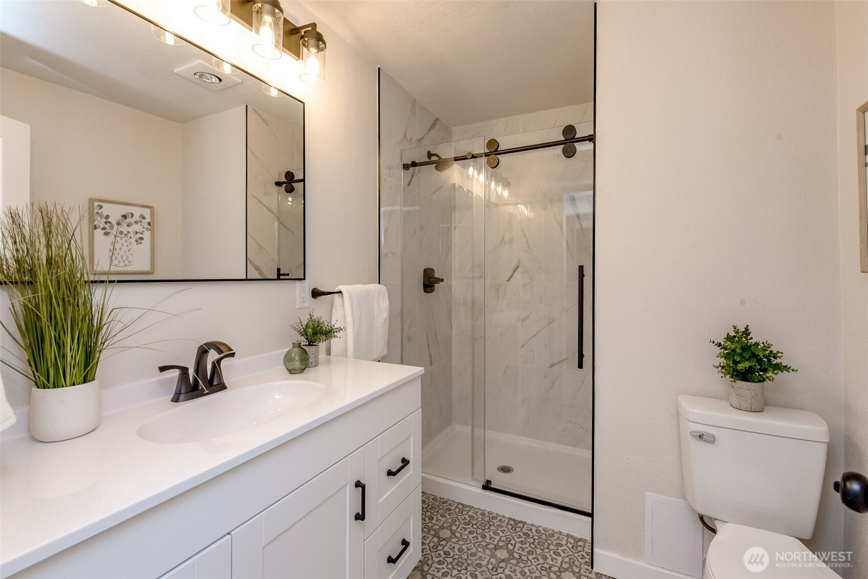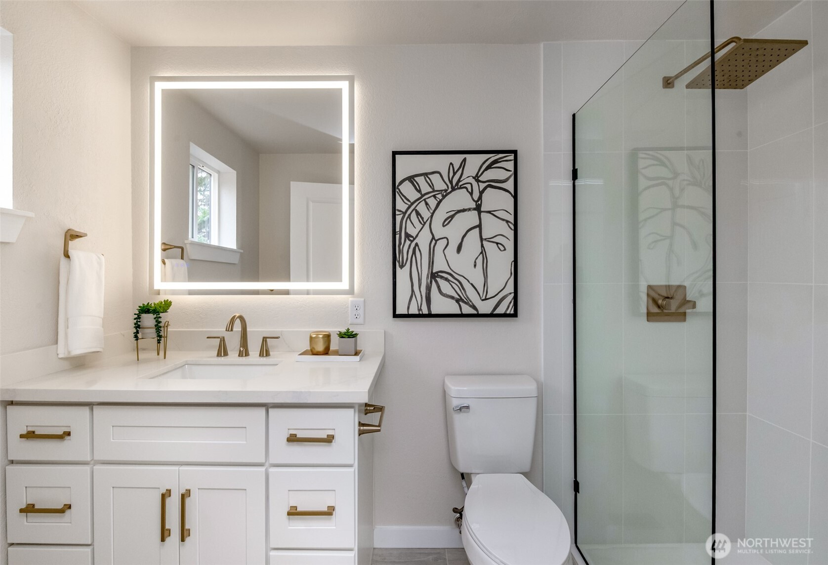 Step inside this stunning home & fall in love with its stylish finishes & functional layout. The spacious living room flows seamlessly into a bright, open kitchen featuring an island, tile backsplash, quartz countertops, & stainless-steel appliances. Main bathroom showcases quartz countertops & a tiled tub/shower surround. The primary suite exudes luxury with a white shaker vanity, quartz countertop, a sleek LED lighted mirror, & a beautifully tiled shower surround accented by champagne bronze fixtures. Downstairs, the versatile lower level has a stylish dry bar with a beverage cooler, picket-tile backsplash, & floating shelves. Fully fenced backyard. 2-car garage. Located just minutes from schools, parks, shopping, & easy freeway access.