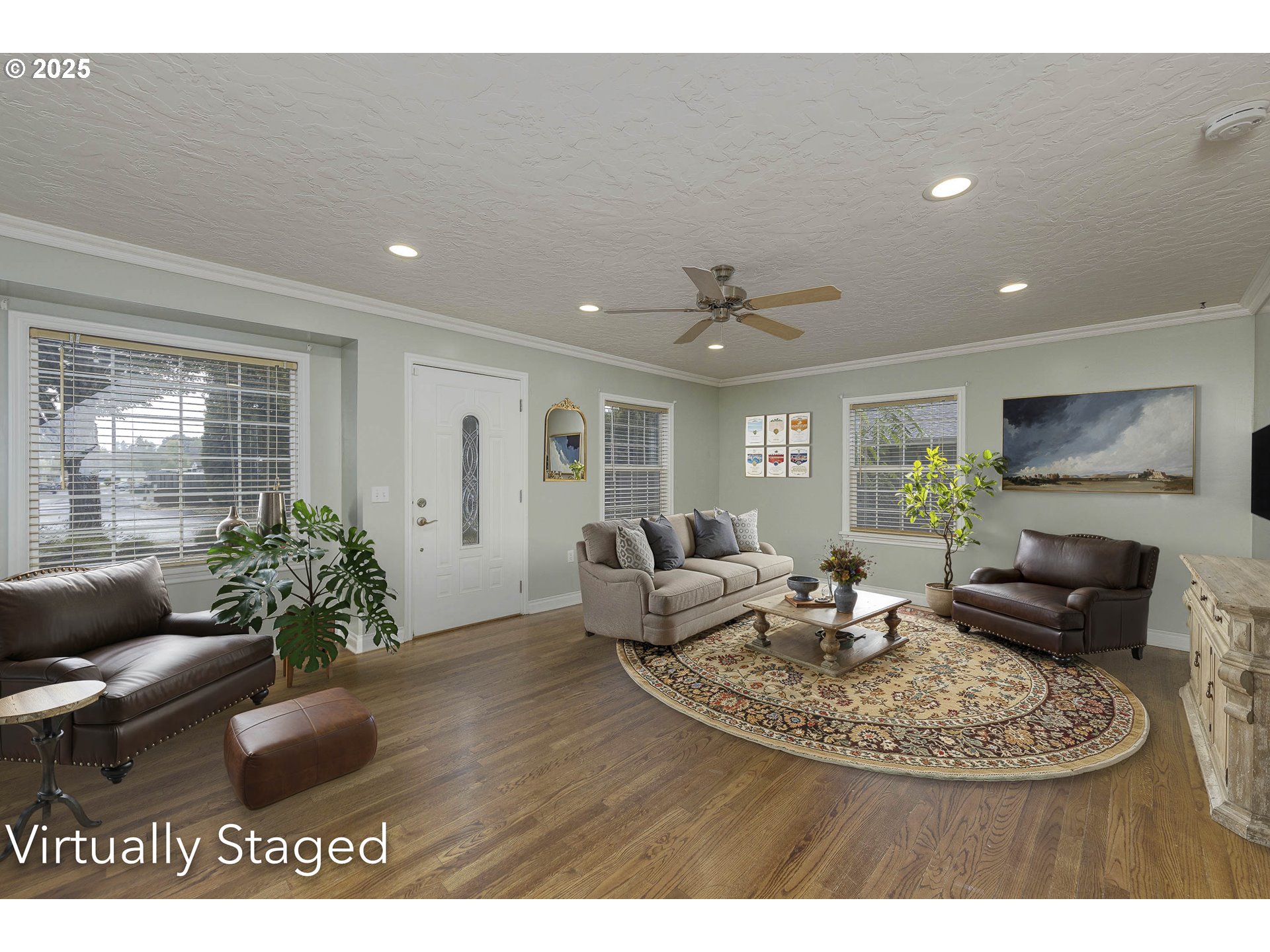 Welcome to this move in ready 3 bedroom plus office home. Spacious living room with hardwood floors and large open kitchen both provide dining/eat areas. Primary on main with laminate flooring plus office (no closet). Upstairs are 2 additional bedrooms and 1/2 bathroom. Converted oversized 1 car garage provides the perfect finished family room off the kitchen and has access to fenced back yard with covered patio AND additional patio, fruit trees (apple & pear) and dog run. Extra deep driveway has RV parking and hook up. New 95% efficient gas furnace and AC in 2022. Newer free standing gas range, all stainless appliances are included.