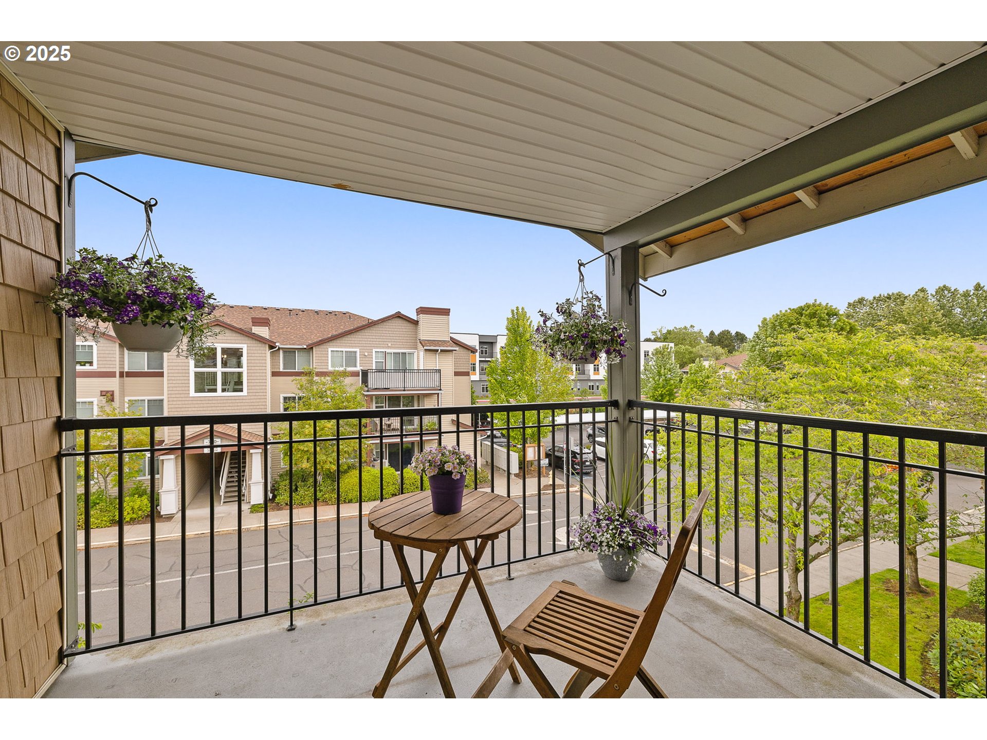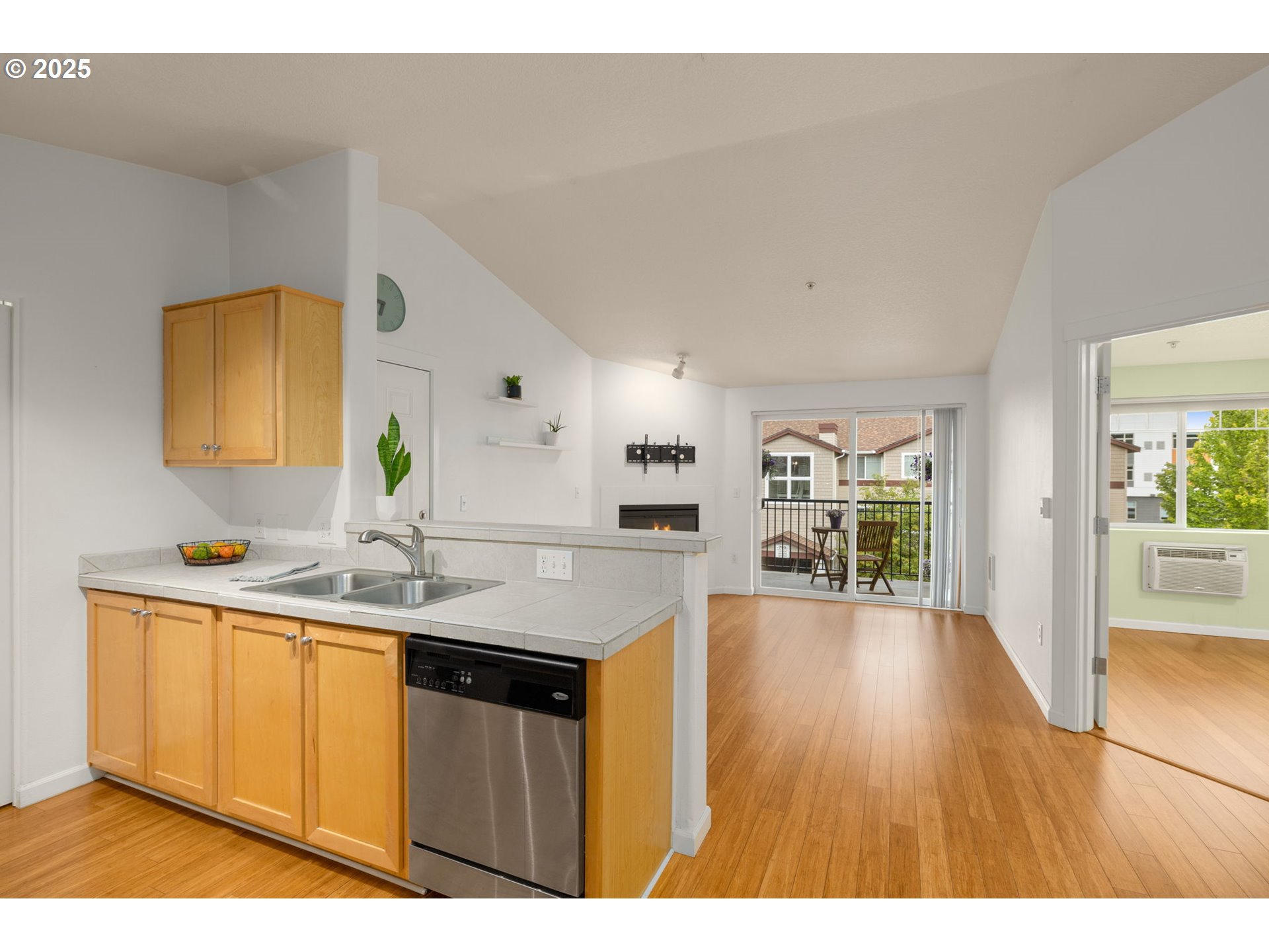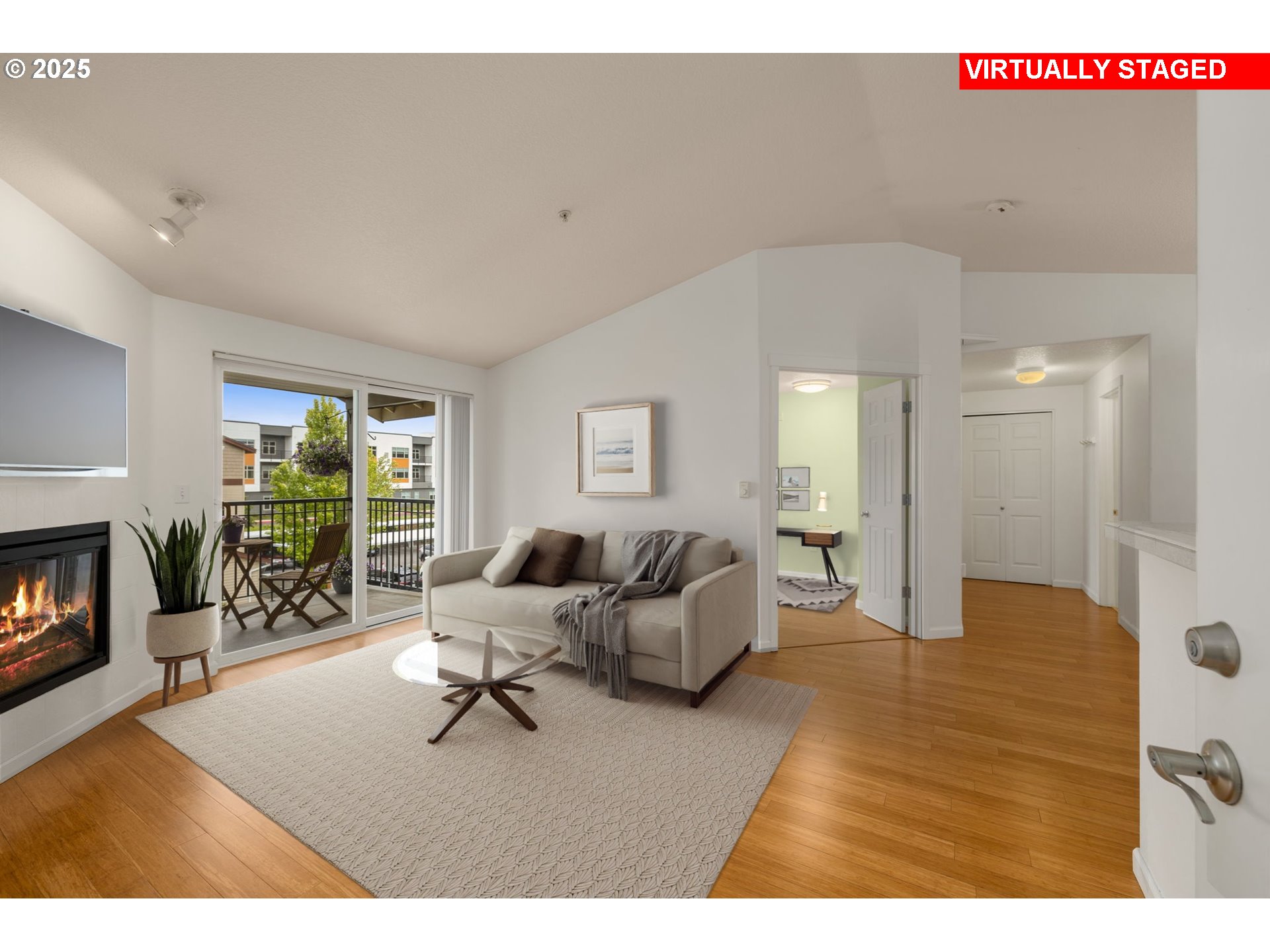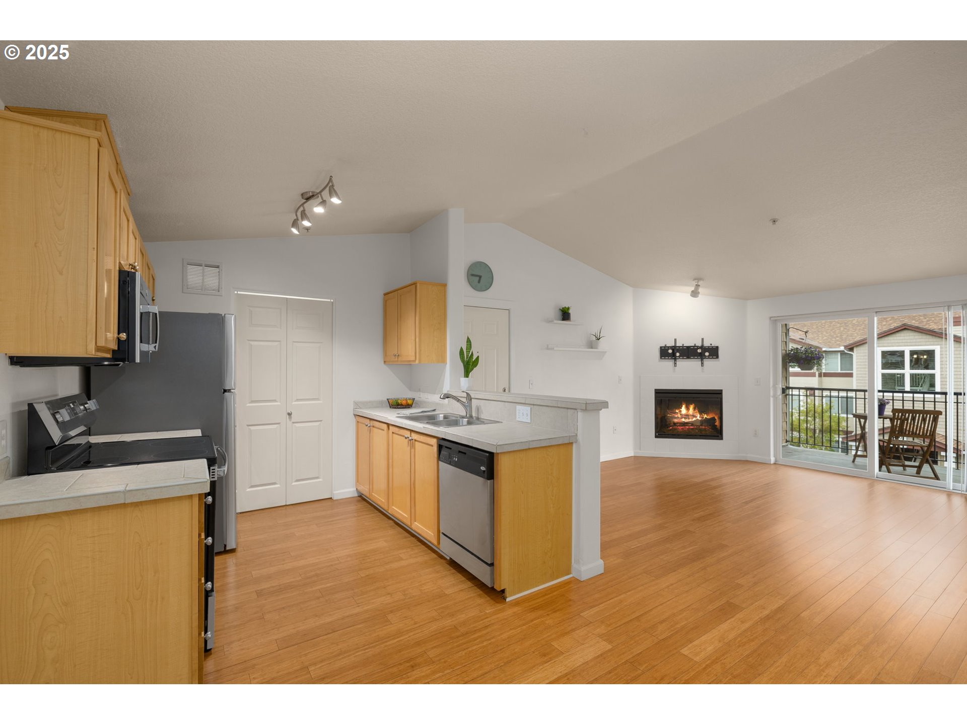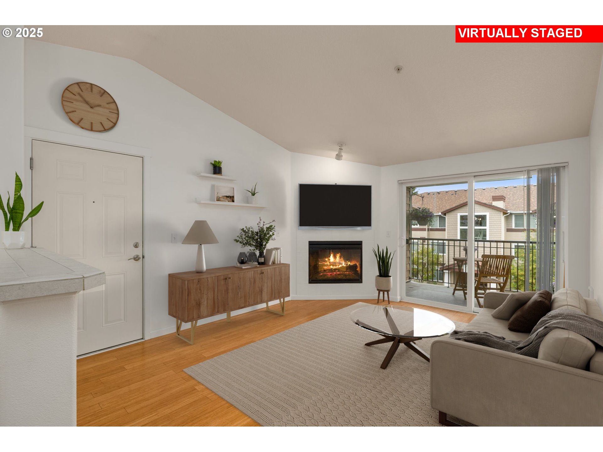 Welcome to this bright and spacious 3rd-floor vaulted condo offering 2 bedrooms and 1 bath in a highly desirable community. Enjoy an open-concept layout filled with natural light, vaulted ceilings in the living, dining, and kitchen areas, and bamboo flooring throughout. The kitchen features brand-new stainless steel range and microwave. Relax by the cozy fireplace or step out onto your private covered deck, which includes additional storage. The primary bedroom boasts a generous walk-in closet, while the second bedroom with charming French doors adds versatility—perfect for guests or a home office. All kitchen appliances, washer, and dryer are included. HOA covers water, sewer, and trash for added convenience, plus a deeded carport. Excellent location with easy access to public transportation, major freeways, Nike, Intel, top hospitals, parks, and The Streets of Tanasbourne shopping and dining. Don’t miss this opportunity!