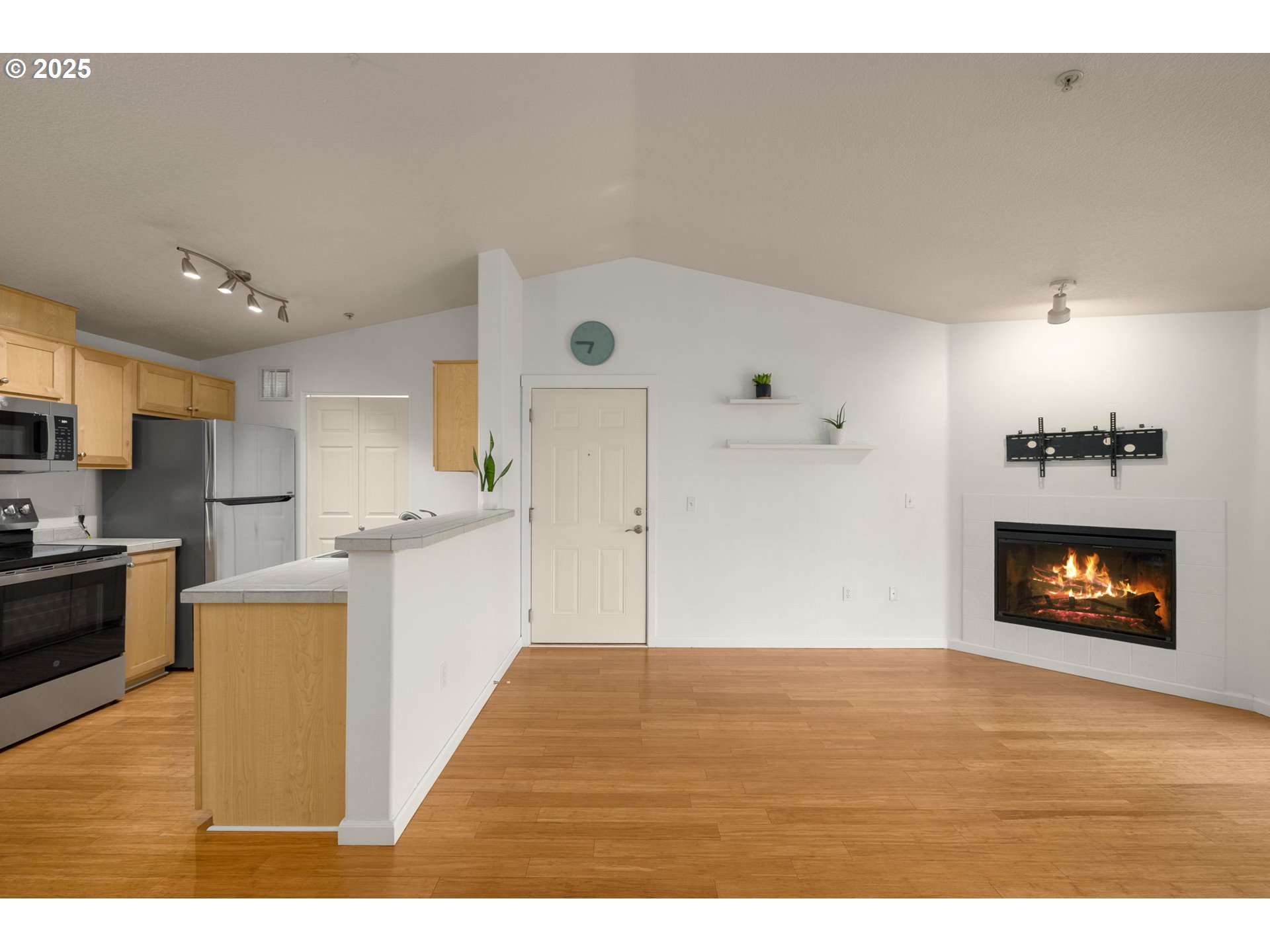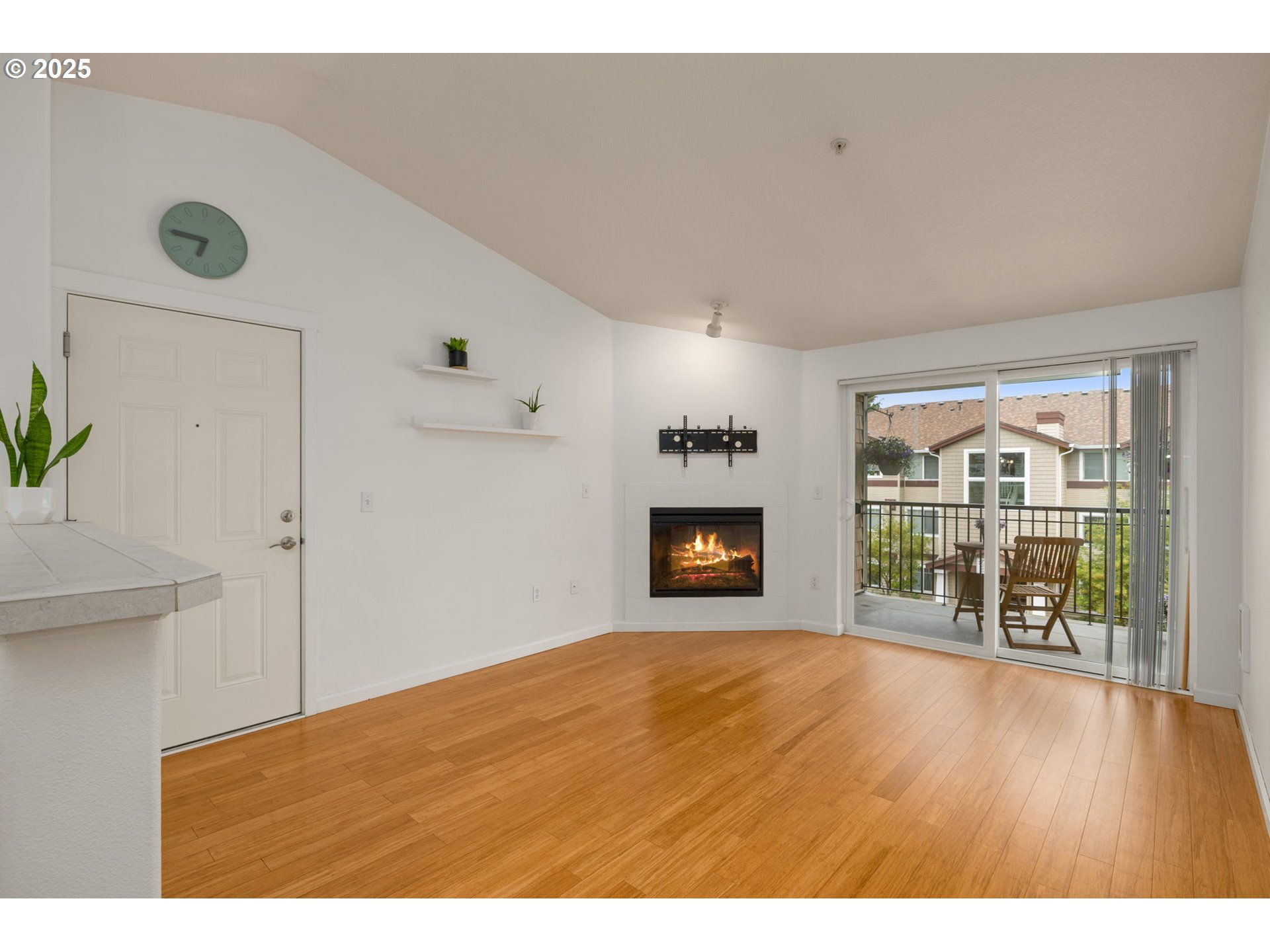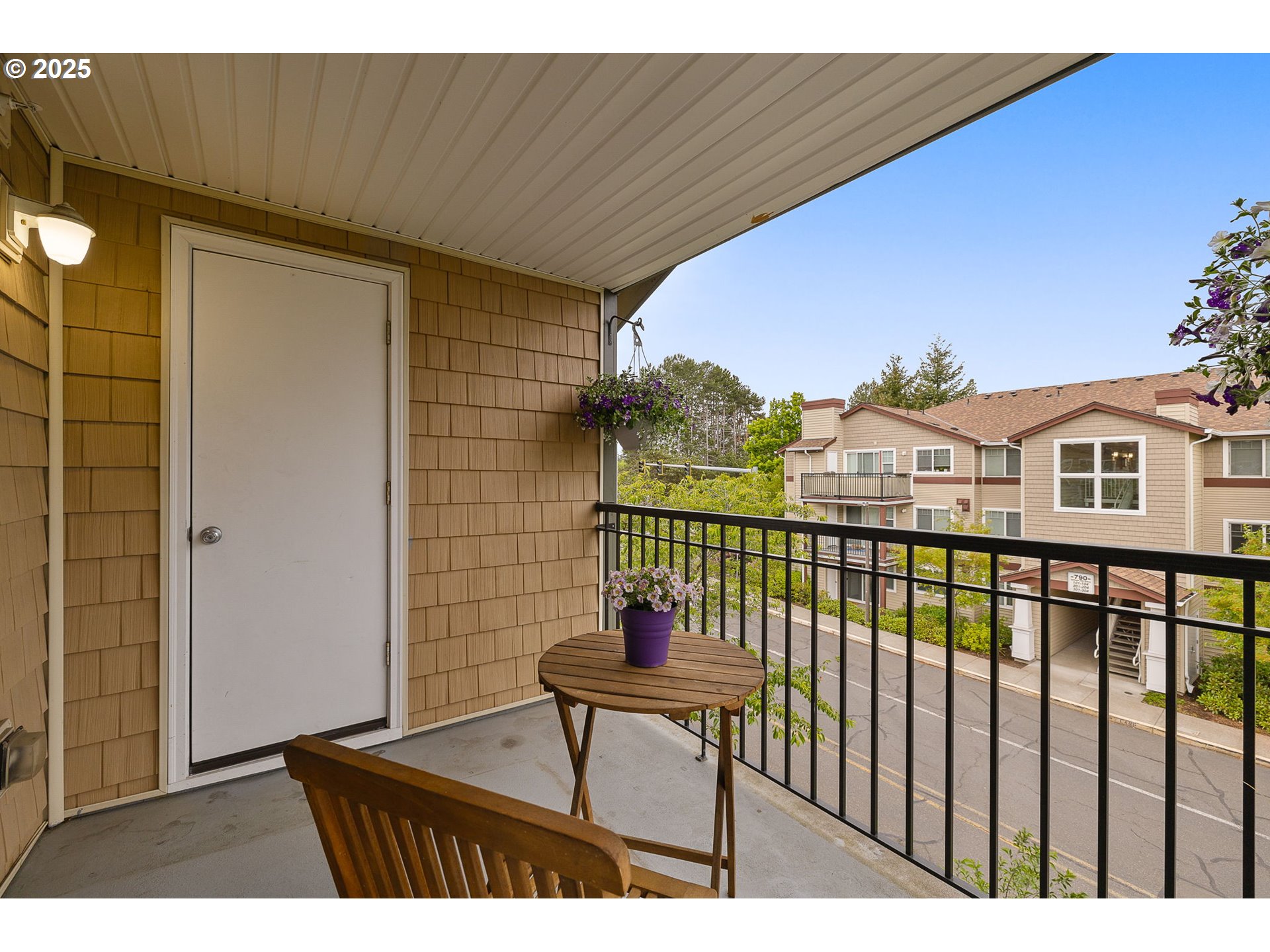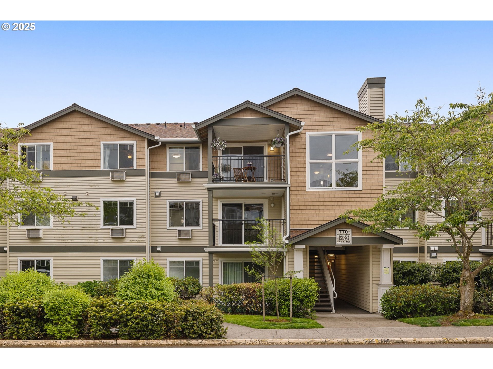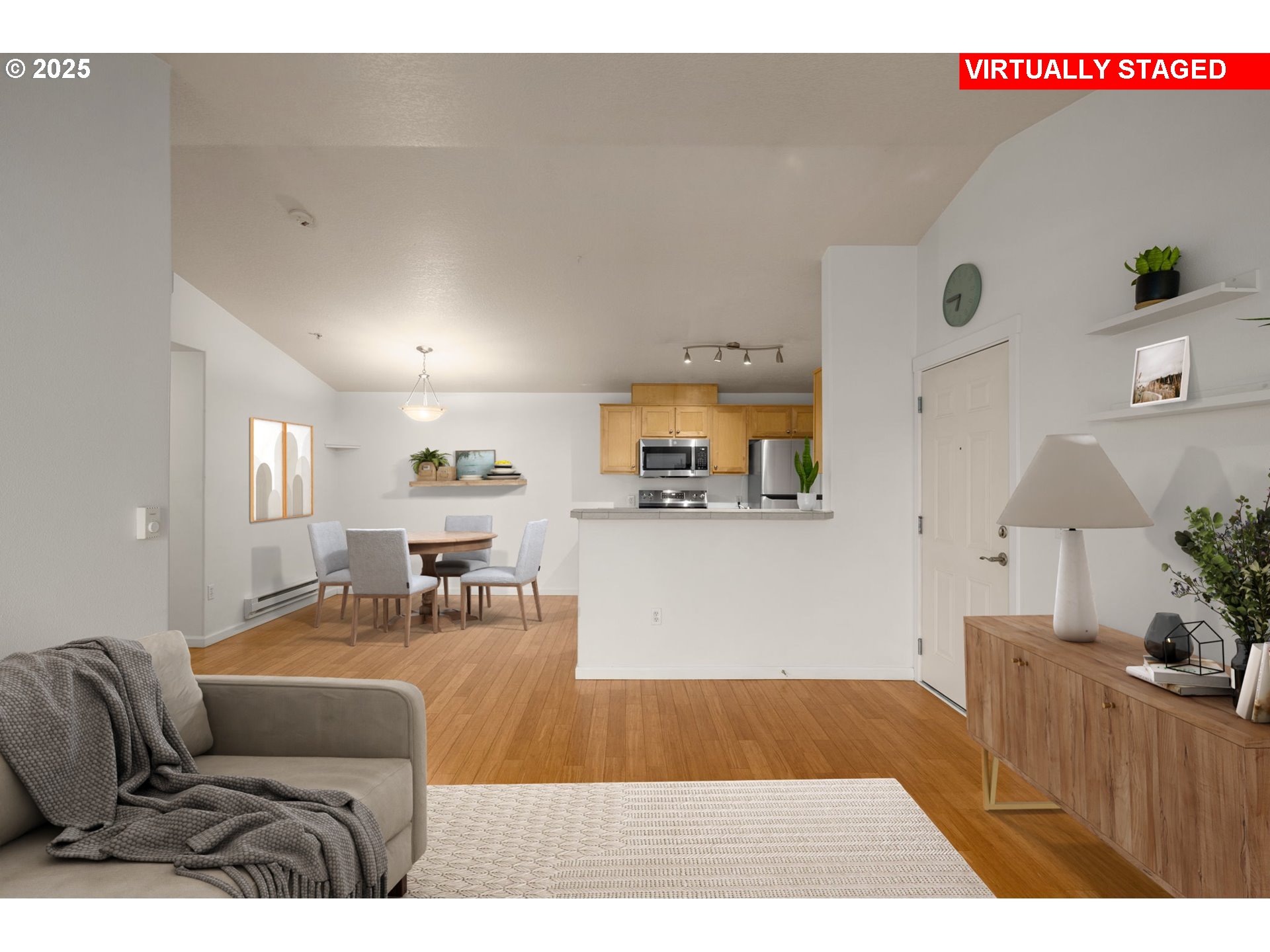 Welcome to this bright and spacious 3rd-floor vaulted condo offering 2 bedrooms and 1 bath in a highly desirable community. Enjoy an open-concept layout filled with natural light, vaulted ceilings in the living, dining, and kitchen areas, and bamboo flooring throughout. The kitchen features brand-new stainless steel range and microwave. Relax by the cozy fireplace or step out onto your private covered deck, which includes additional storage. The primary bedroom boasts a generous walk-in closet, while the second bedroom with charming French doors adds versatility—perfect for guests or a home office. All kitchen appliances, washer, and dryer are included. HOA covers water, sewer, and trash for added convenience, plus a deeded carport. Excellent location with easy access to public transportation, major freeways, Nike, Intel, top hospitals, parks, and The Streets of Tanasbourne shopping and dining. Don’t miss this opportunity!