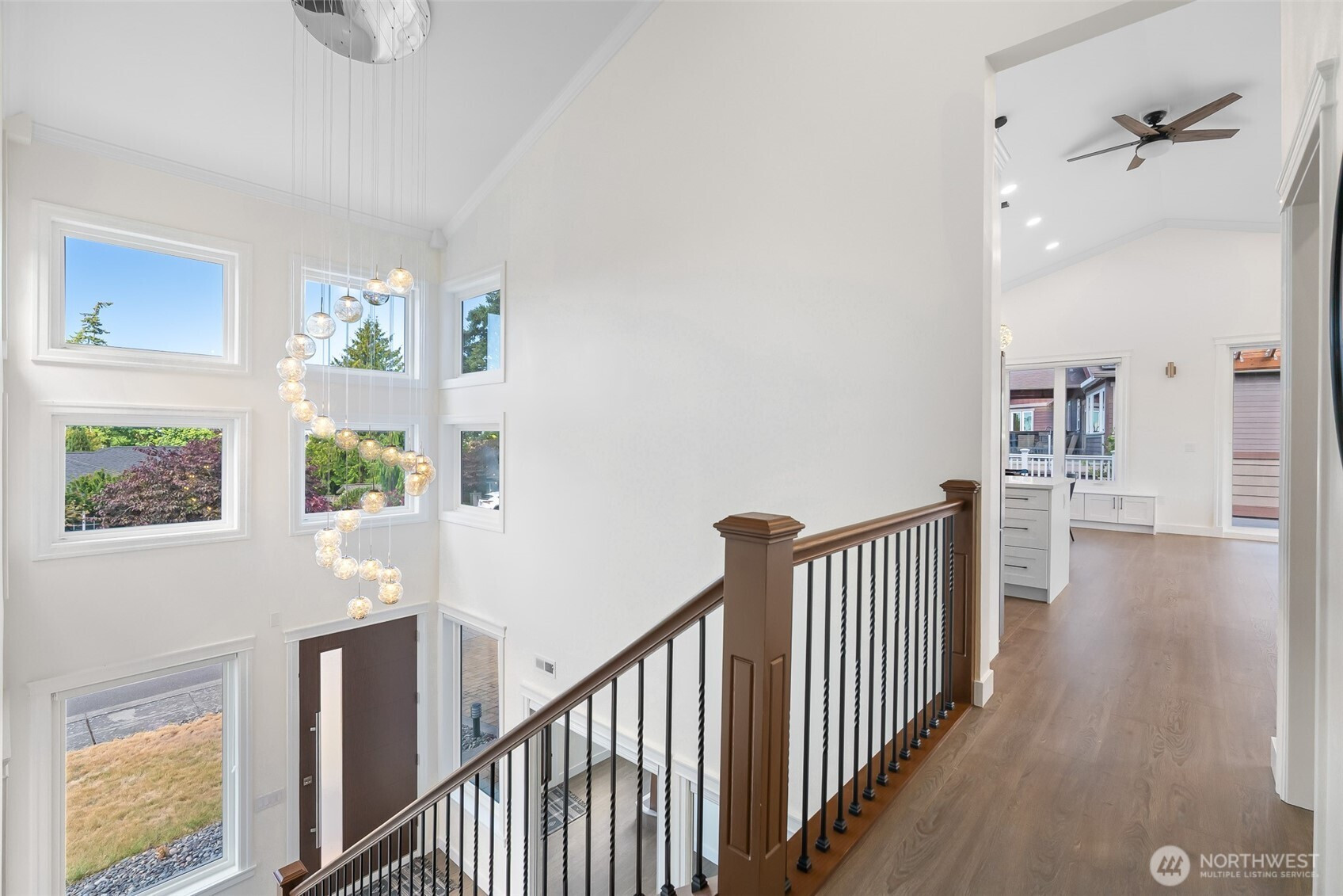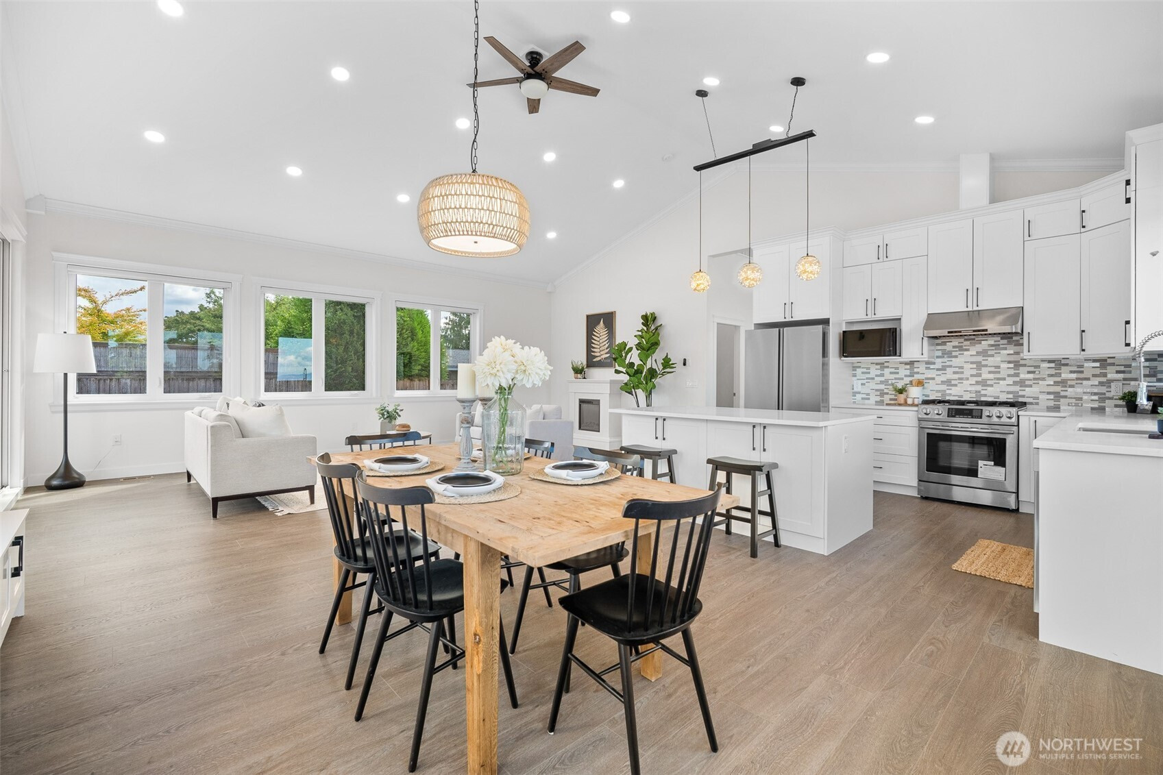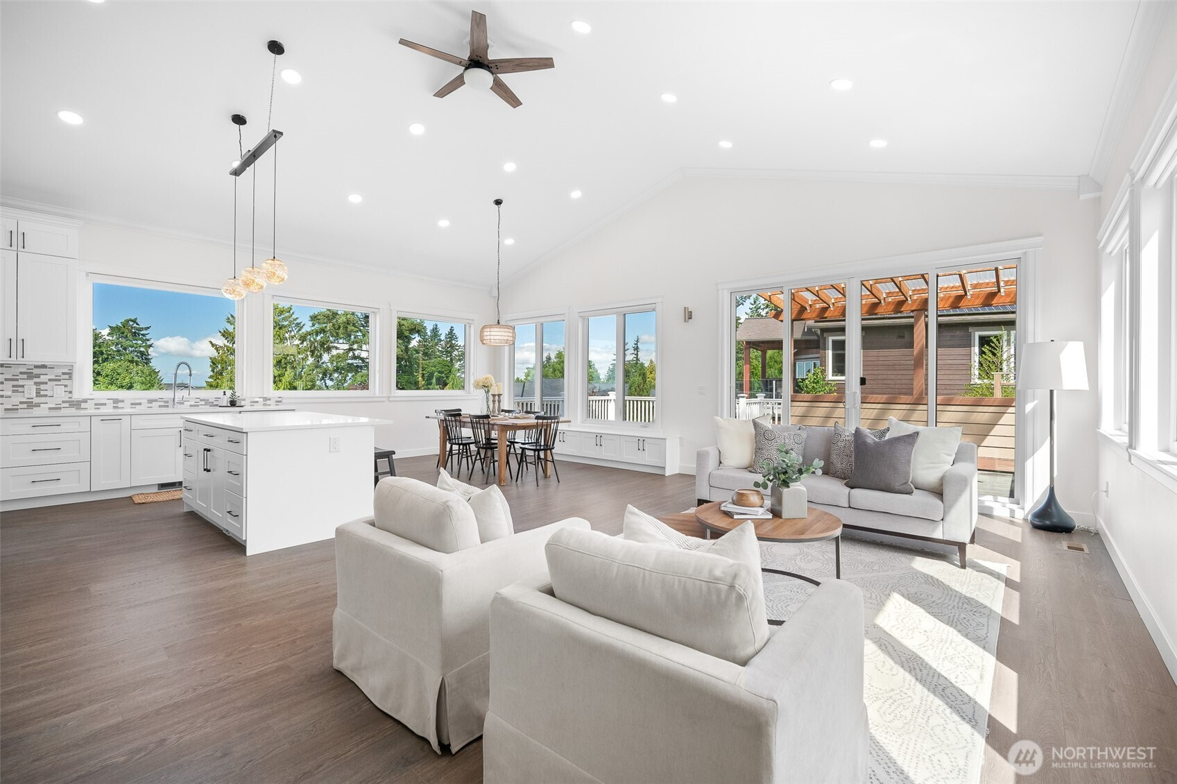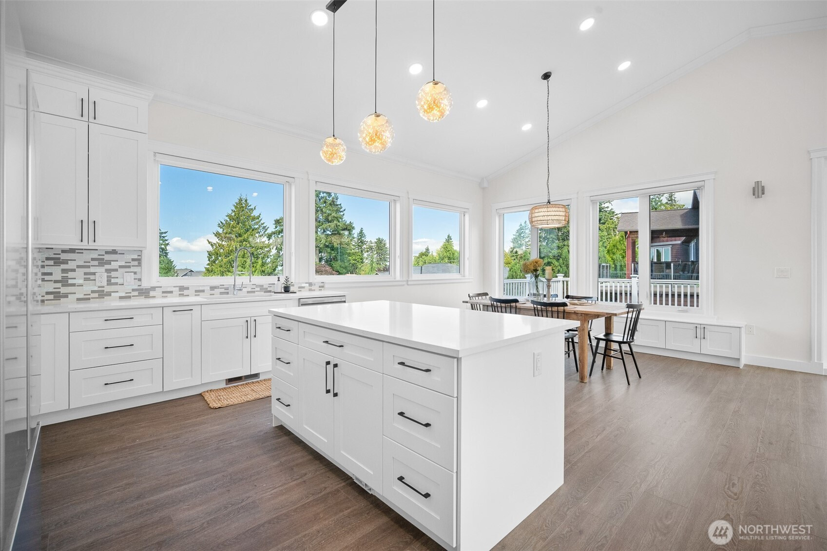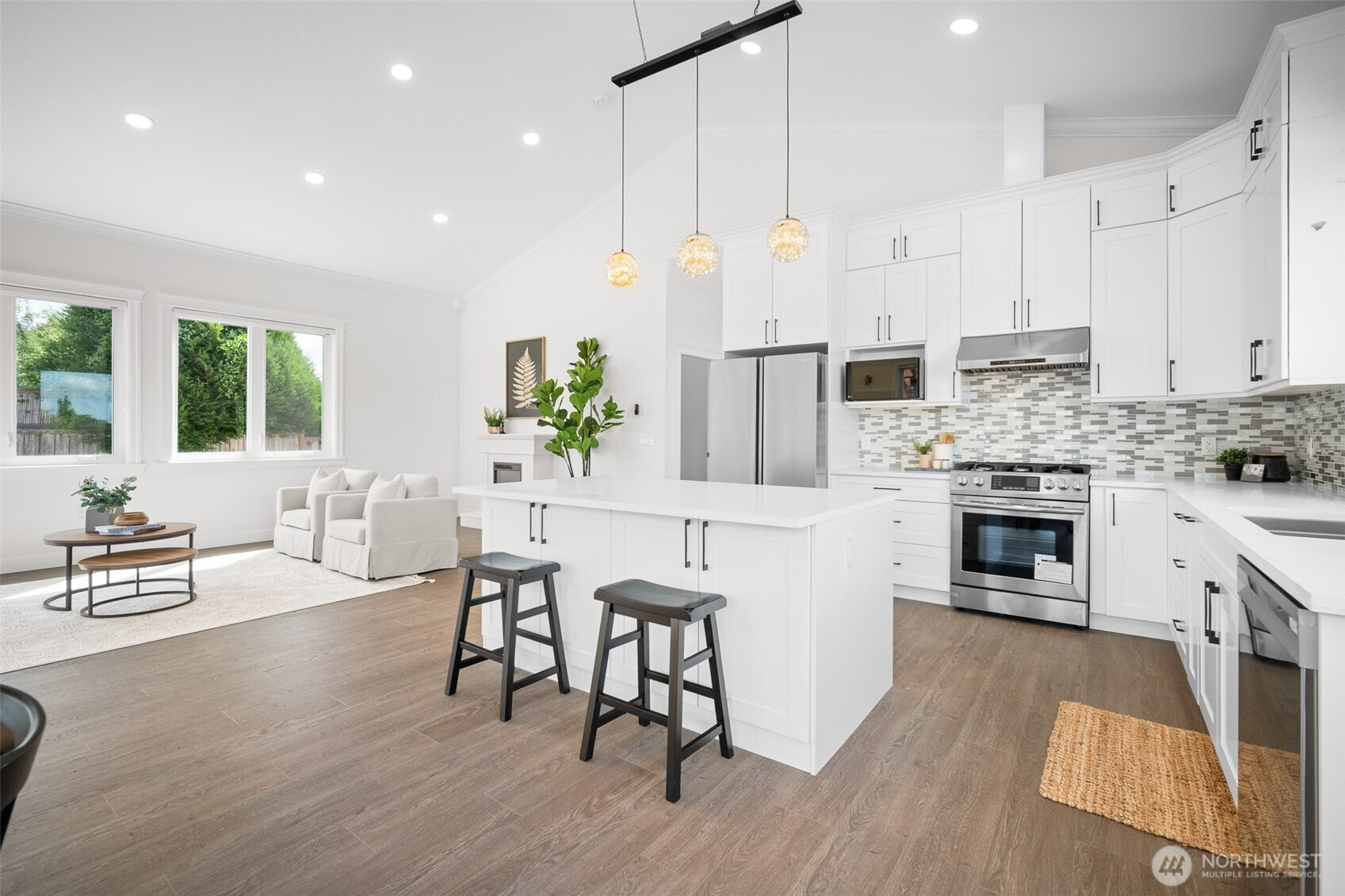 Modern luxury in a prime Bellingham location! Stunning custom-built home, short walk to Lake Whatcom, Whatcom Falls Park, trails, Barkley Village, and downtown. Soaring 15’ ceilings and expansive windows fill the open-concept living and dining areas with natural light, flowing seamlessly to a spacious deck—perfect for relaxing or entertaining. The chef’s kitchen features quartz countertops, stainless steel appliances, a walk-in pantry, and a large island with seating and storage. The main-level primary suite is a serene retreat with a spa-inspired bath and oversized shower. A second en-suite bedroom offers great flexibility. Downstairs includes a home office, media room, and game room. High-efficiency heat, A/C, and spacious 3-car garage.